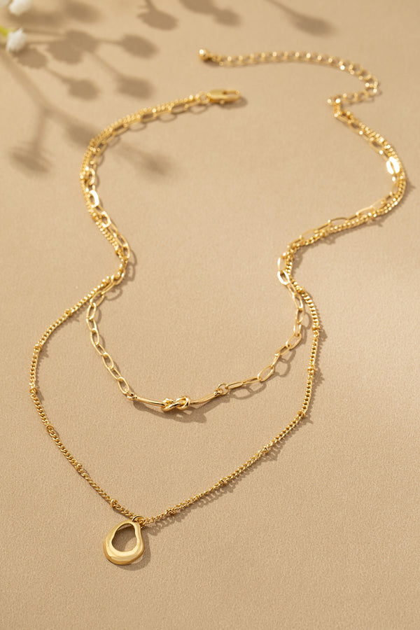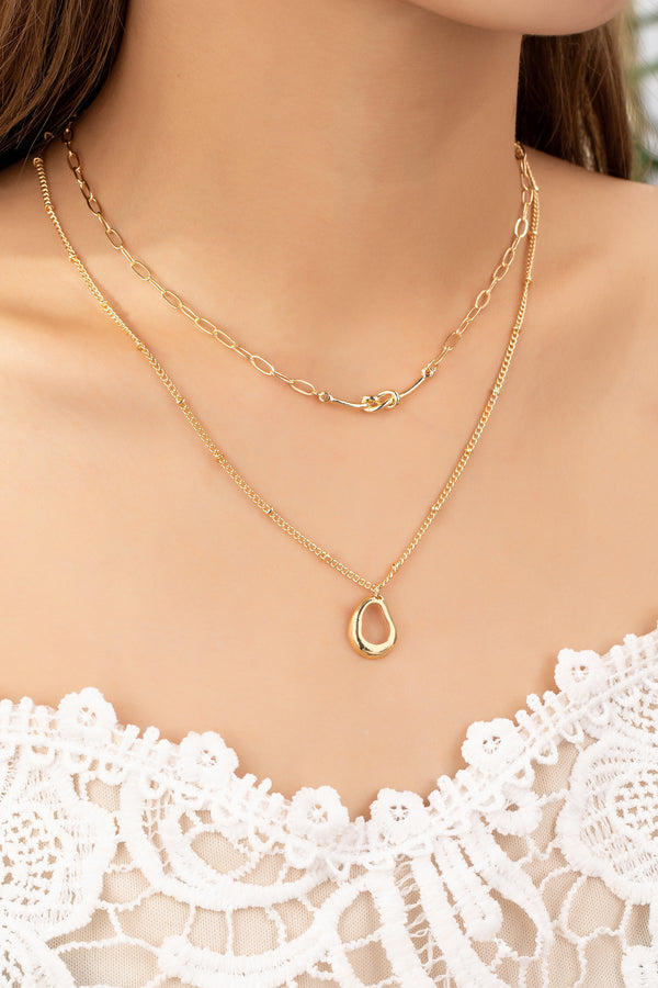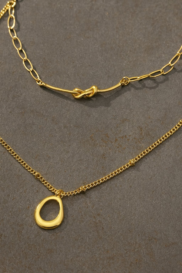 Add a splash of playful elegance to your look with the Knot So Fast Layered Necklace. Featuring a chic two-layer design, the shorter chain flaunts a knotted bar pendant on a trendy paperclip chain, while the longer chain showcases a smooth, organic-shaped charm. Made from a durable alloy with shiny gold plating, this necklace promises both style and lasting wear. The adjustable lobster clasp with a 2-inch extender guarantees a comfortable fit. Wear it solo for a subtle sparkle or mix it up with other dainty chains to turn heads wherever you go!