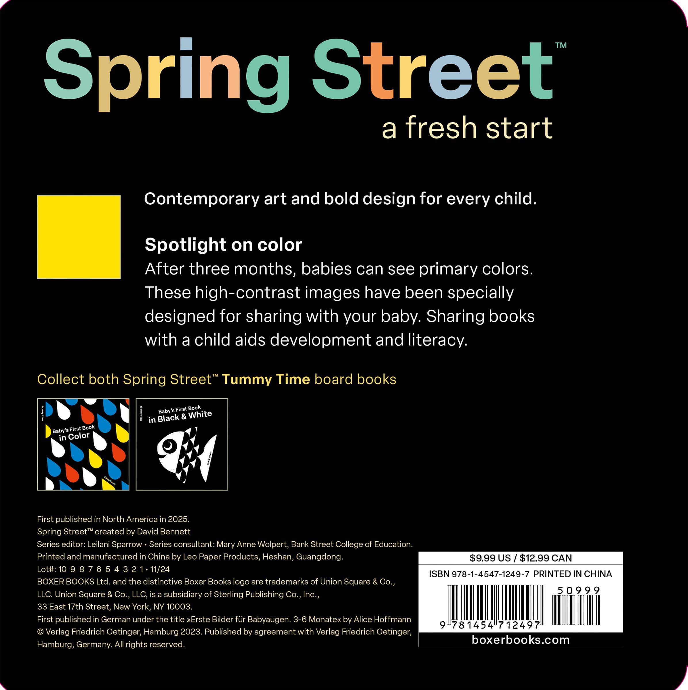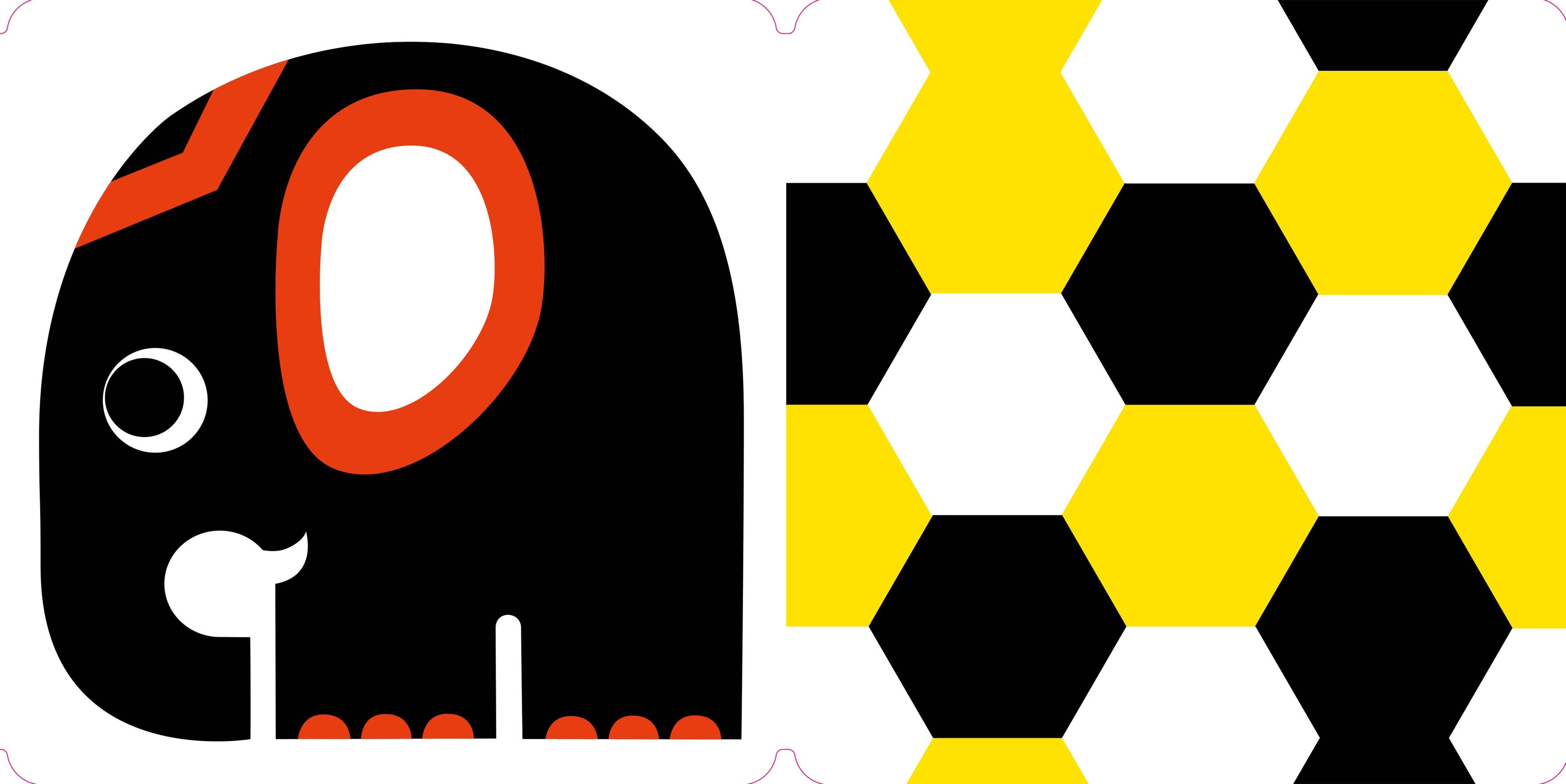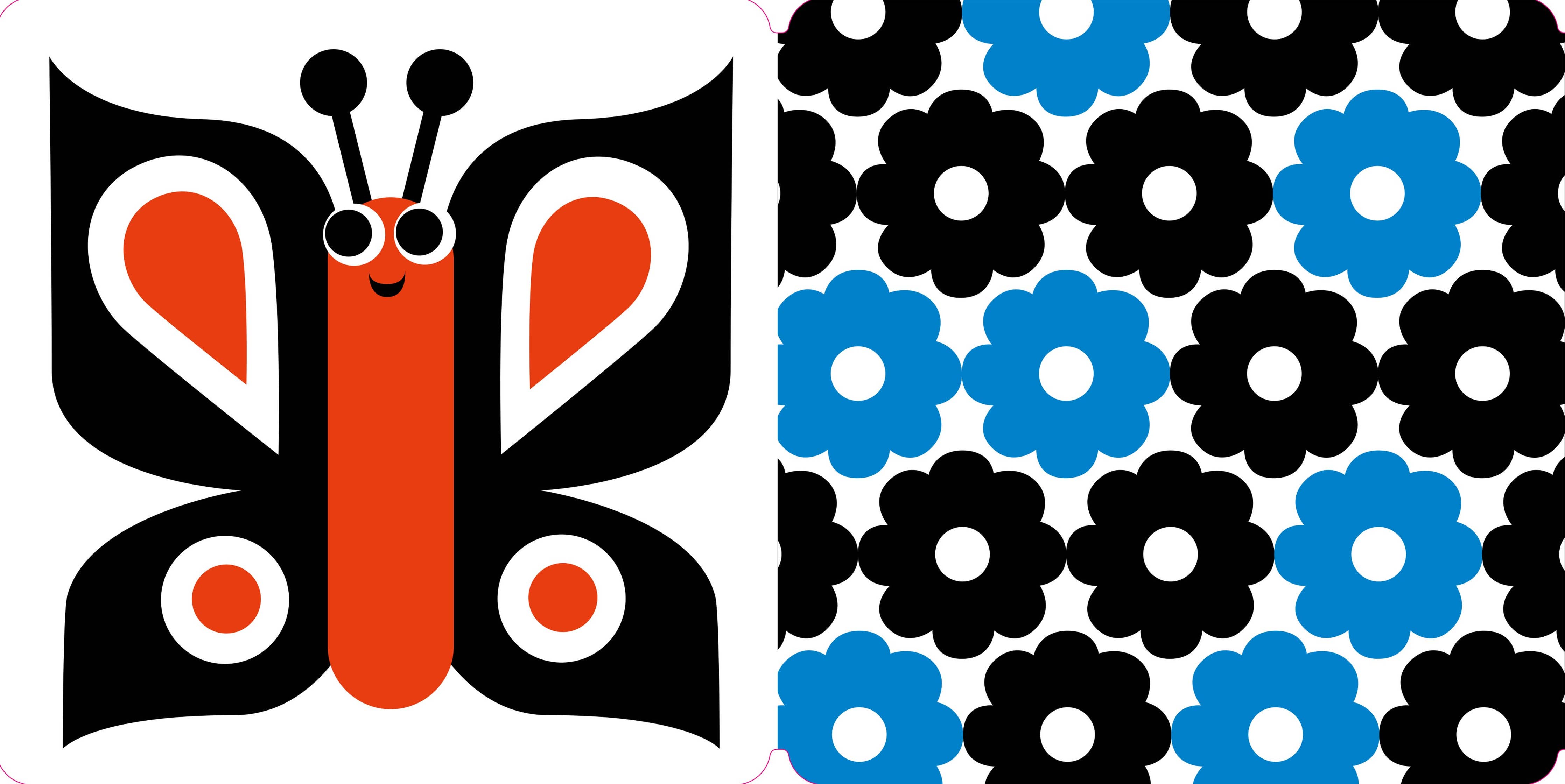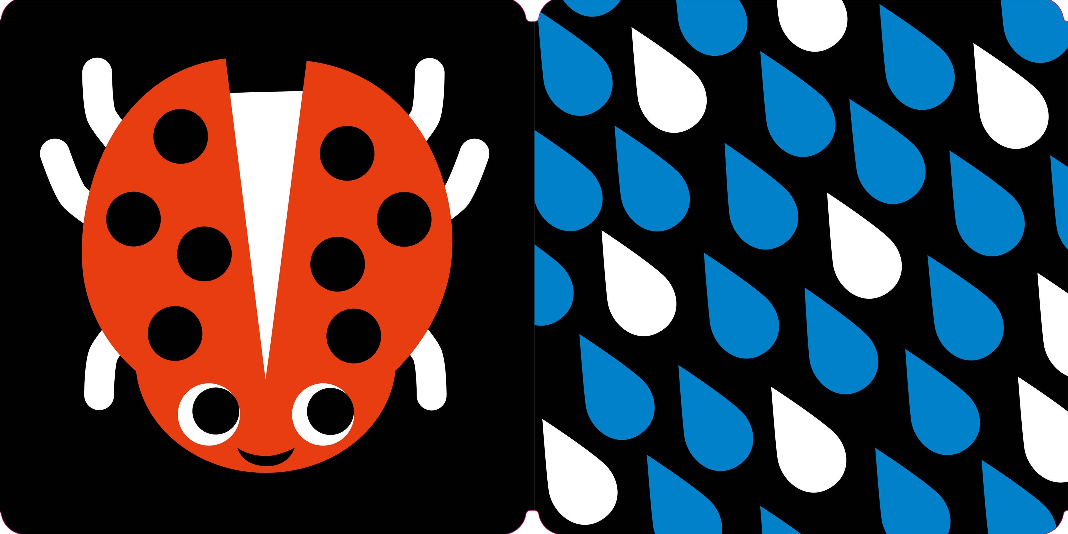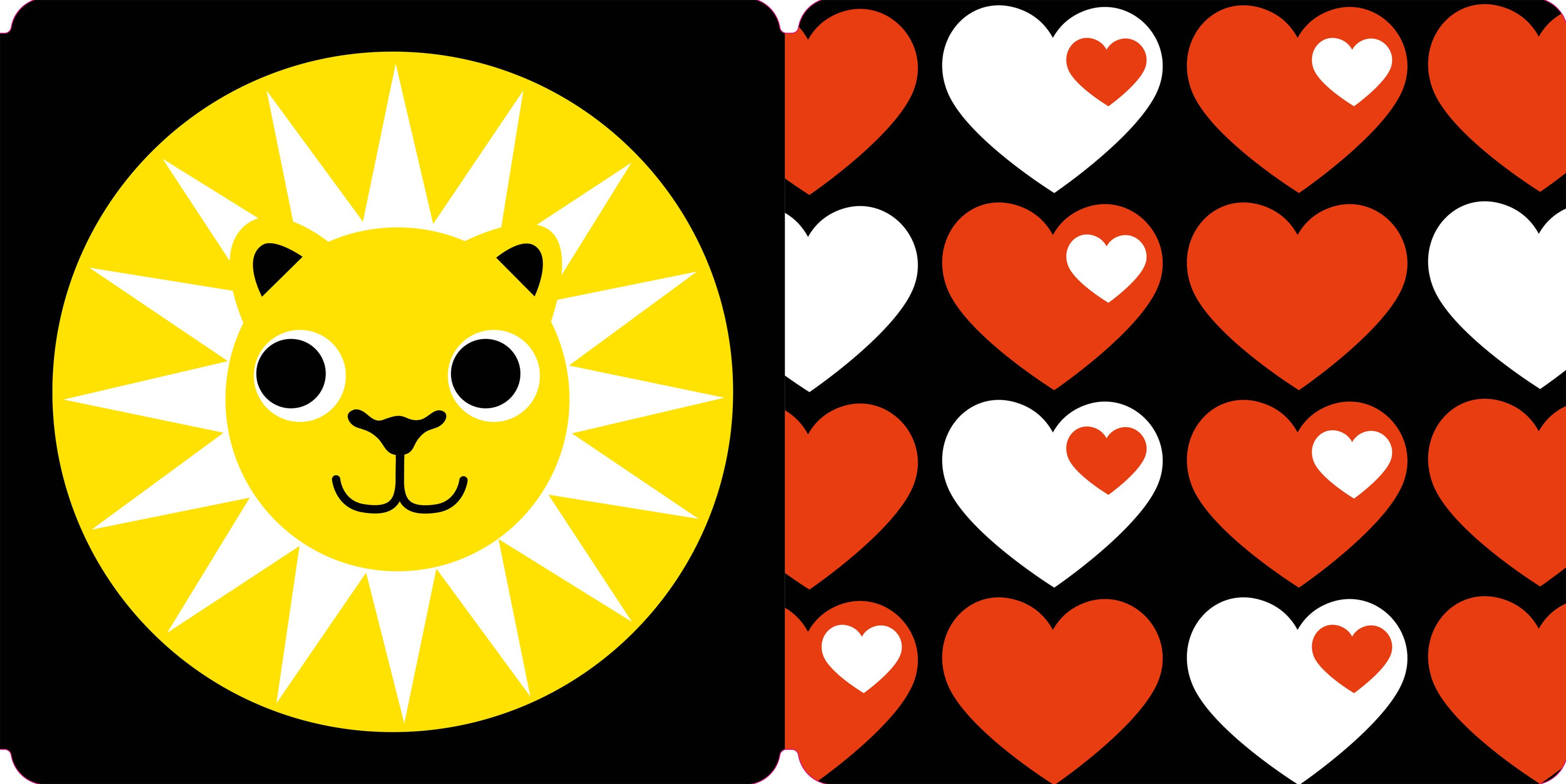 Fold-out and stand-up board book—perfect for baby tummy time—and based on proven research. Fold-out board concertina books, based on proven scientific research about how babies see. Did you know babies' eyes can see high-contrast black-and-white from birth—and black, white, and primary colors from three months. Five spreads of exciting patterns and cute animals. These books, which fold out and stand up, are perfect for shared reading. With its ten images in black, white, and primary colors, they are perfectly designed for the eyes of babies and offer a fun way for parents and babies to spend time together. Five pages of exciting patterns and five pages of cute animals give every baby the opportunity to find the image that appeals to them most. Children's Board Book; 7 X 7 inches; 10 pages.