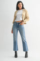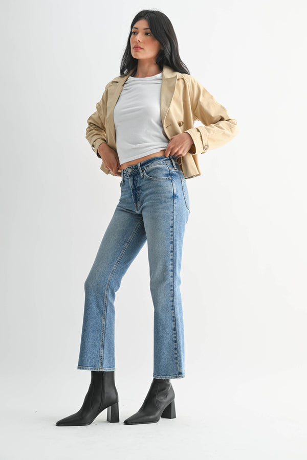 This cropped ankle jean adds a whole new element to your outfit. With a high crop and slight flare in the leg, this pair has as much attitude as it does style.