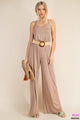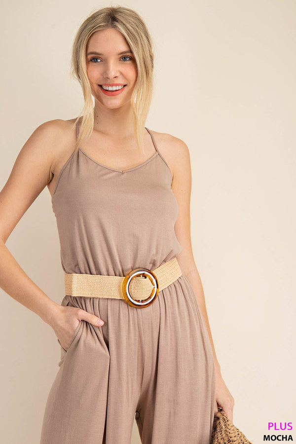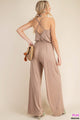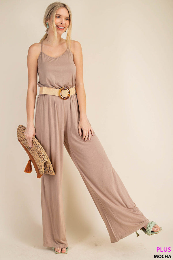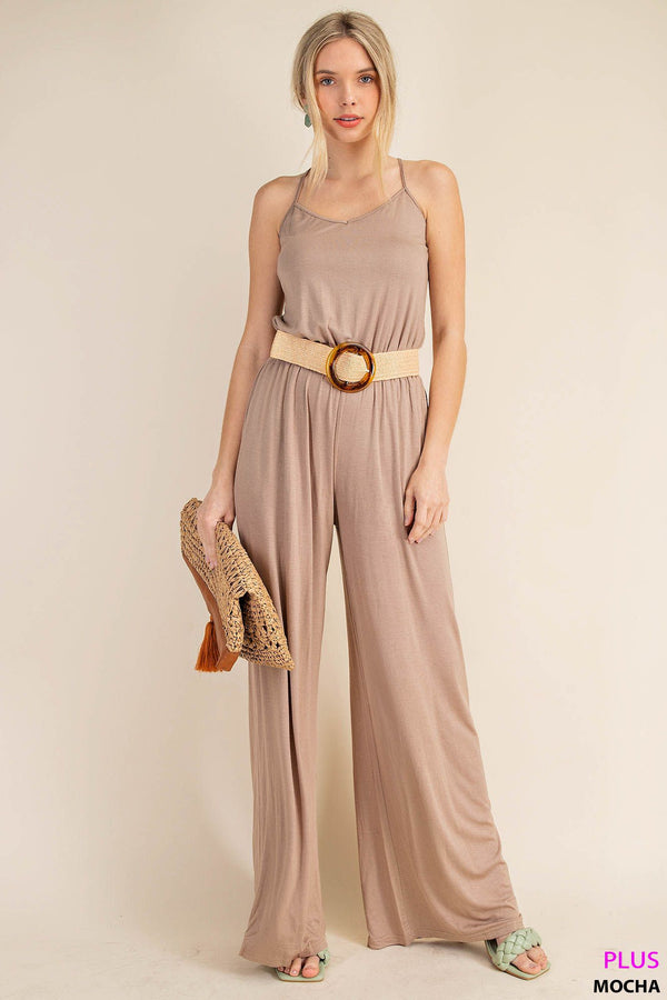 You'll want to permanently live in our Criss Cross Jumpsuit! The sleeveless wide leg design is not only effortlessly stylish, but also incredibly comfortable with its soft and flowy fabric. The adjustable spaghetti straps criss cross in the back, adding a unique and eye-catching detail. Easy to style and perfect for any occasion. Try dressing it up with sandals and statement jewelry or keep it casual with sneakers and a denim jacket.
