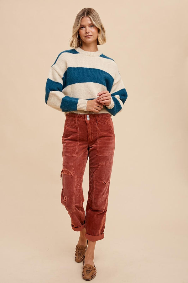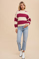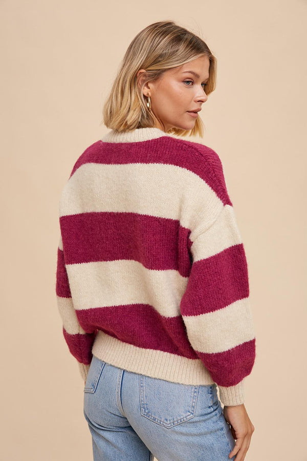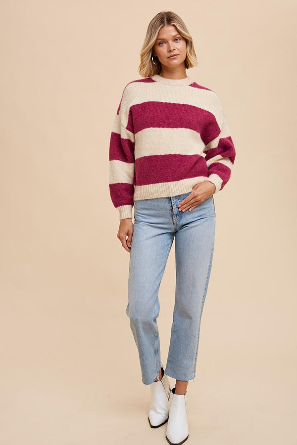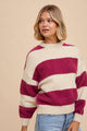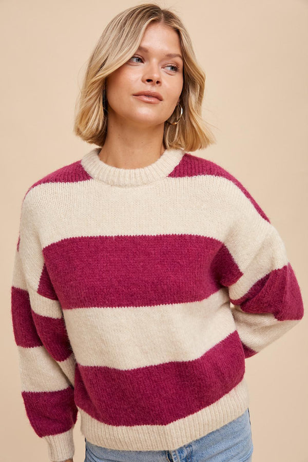 This striped knit sweater is your ticket to winter style that actually feels good. Soft and cozy from the moment you slip it on, it features long sleeves and a comfortable round neckline perfect for layering or going solo. Choose between striking teal/white or magenta/white stripes that inject personality into every outfit. The bold two-tone design transforms basic winter dressing into something fun and fabulous—because comfort and style shouldn't be mutually exclusive.