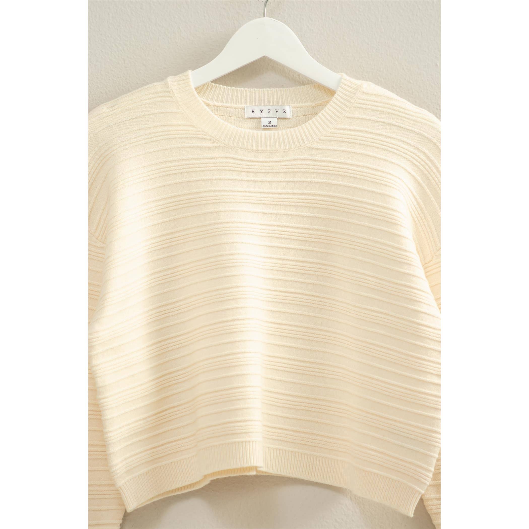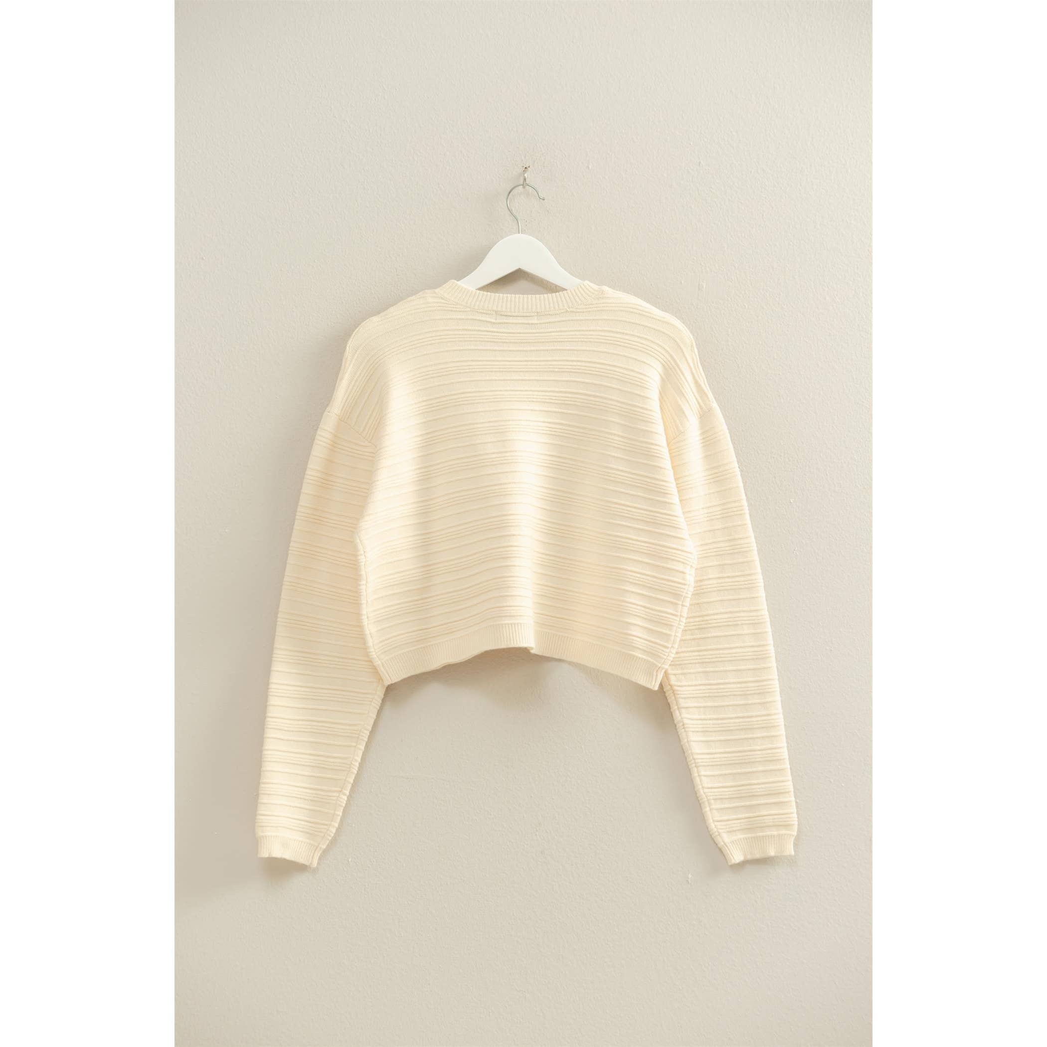 Introducing your new go-to sweater! This textured beauty boasts a subtle ribbed design that's as easy on the eyes as it is on the skin. With its relaxed fit, you'll feel like you're wrapped in a cozy hug all day long. Layer it over a crisp white tee, throw it on with your favorite jeans, or pair it with tailored trousers for that effortlessly chic vibe. Whether you're transitioning between seasons or settling in for a night of pure comfort, this sweater is your trusty companion. Available in timeless black or creamy cream—because sometimes the simplest choices are the best ones.