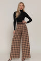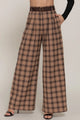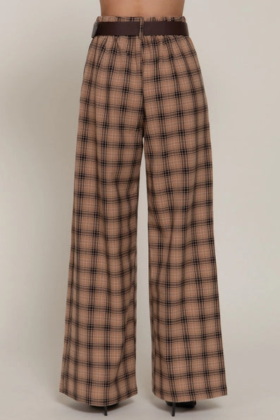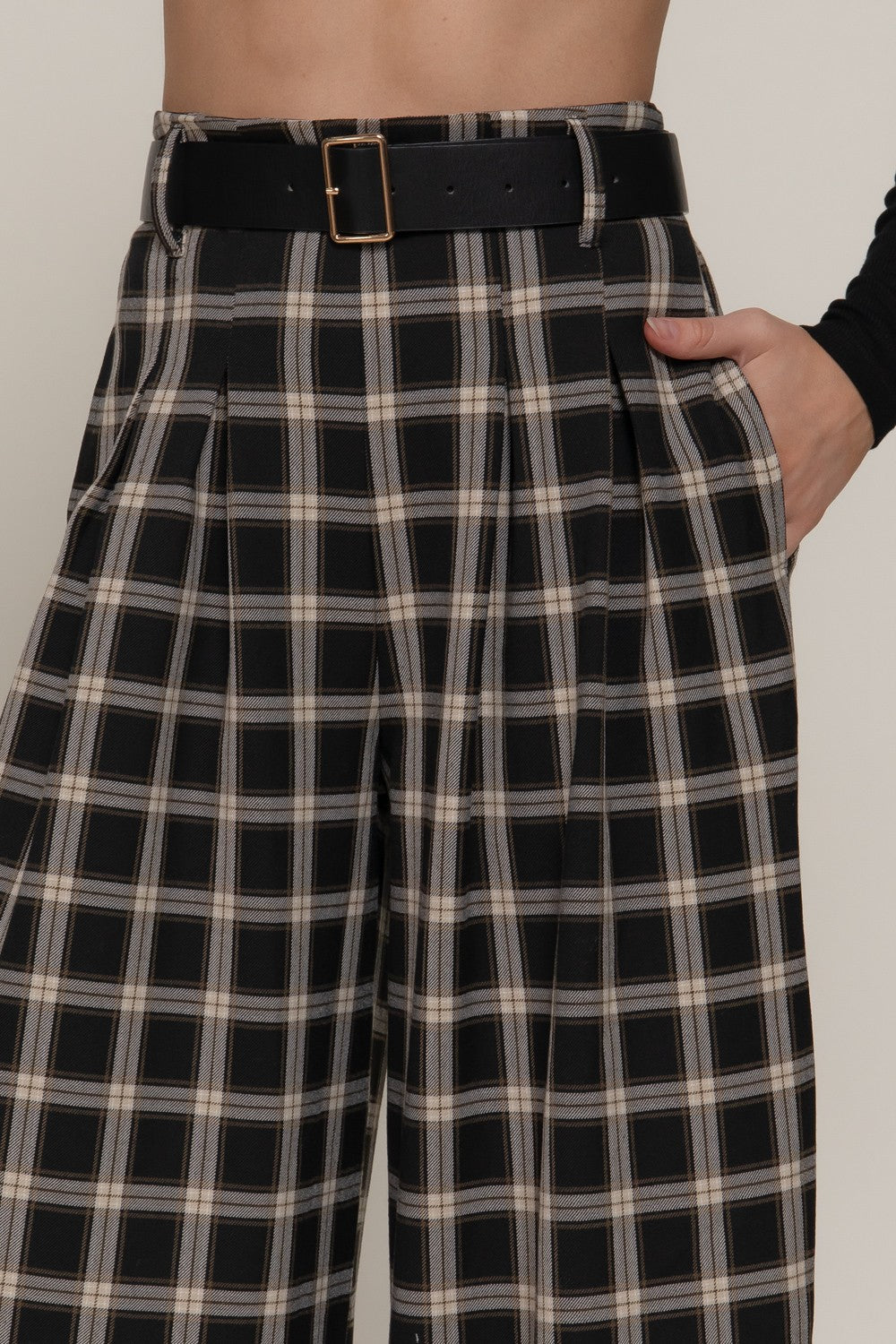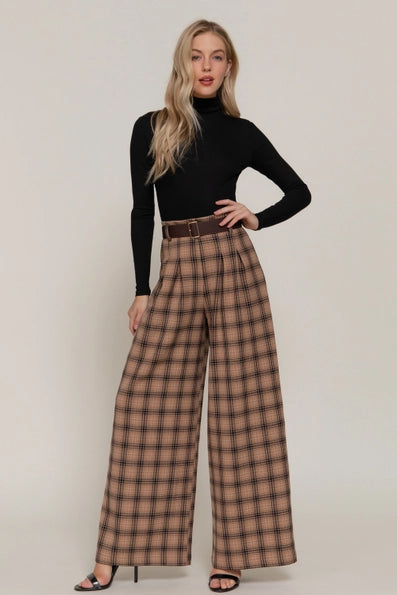 These sharp plaid trousers bring serious style to your everyday rotation. Featuring crisp pleats, a cinched belt, and a sleek side zipper, they're as polished as they are versatile. Dress them up with a blouse for boardroom confidence, or keep it casual with sneakers and a tee. Available in classic black or rich brown, these wide-leg wonders work harder than you'd think—office-ready by day, effortlessly cool by night.