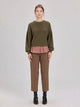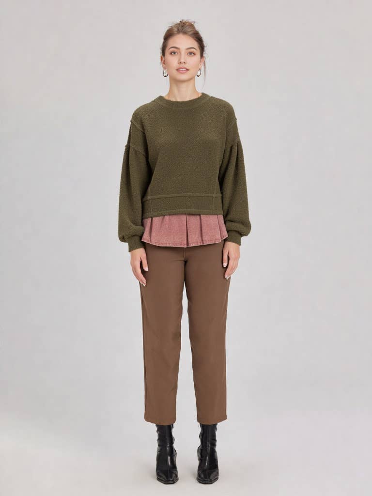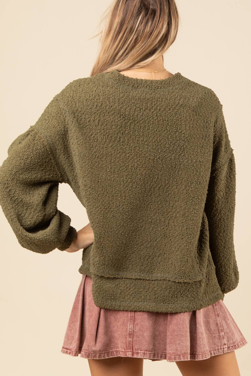Wrap yourself in effortless comfort with this olive green textured knit sweater. Featuring a relaxed oversized silhouette with drop shoulders and long sleeves, it's designed for those days when cozy is non-negotiable. The playful details—shirring, raw edges, and reverse topstitching—add visual interest to this lightweight layer. Perfect for casual vibes, pair it with your favorite denim for a laid-back look or throw it over a skirt for weekend charm. Your new go-to piece for feeling both put-together and wonderfully relaxed.