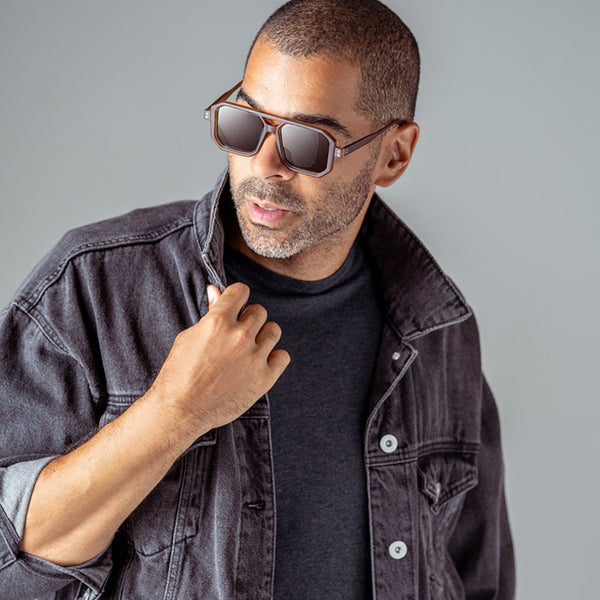 These boxy 80s-style aviators feature light brown frames and classic black lenses.