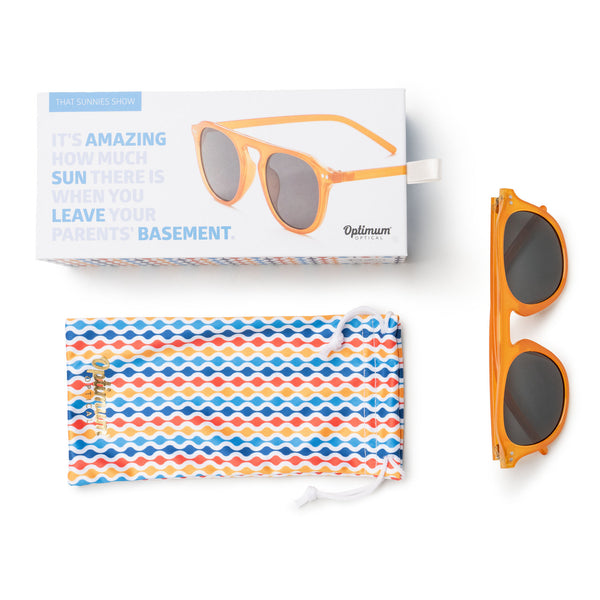 These bright orange frames feature a retro double bridge and rounded black lenses.