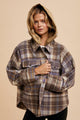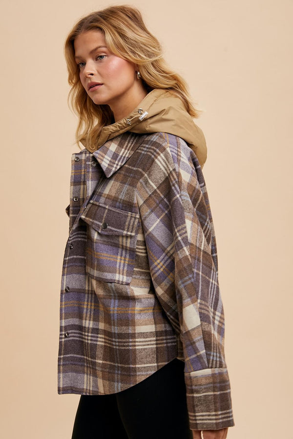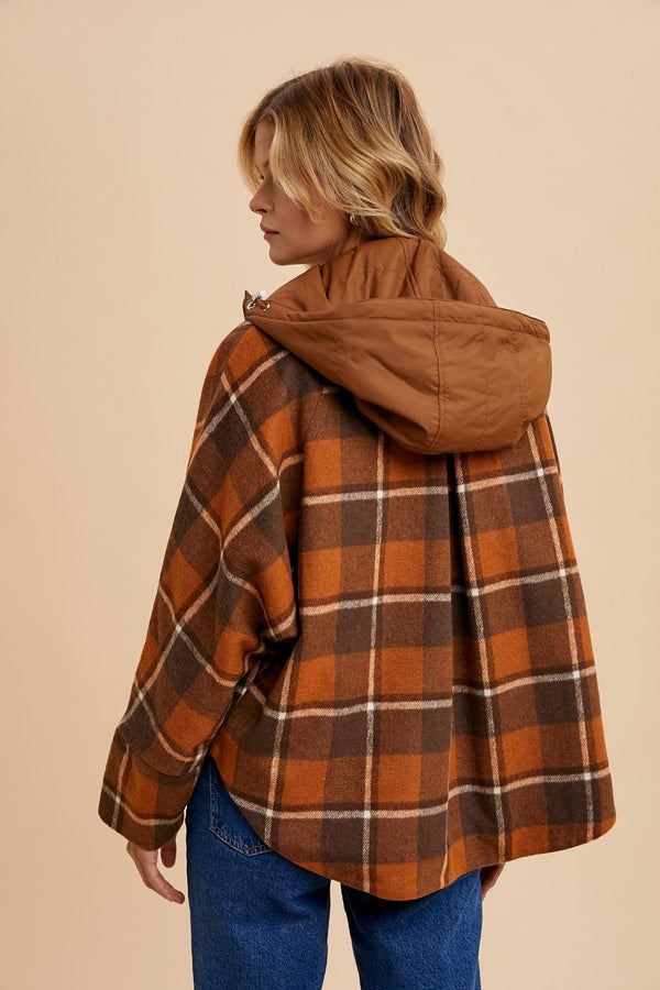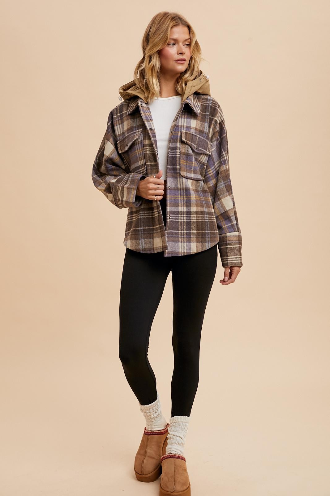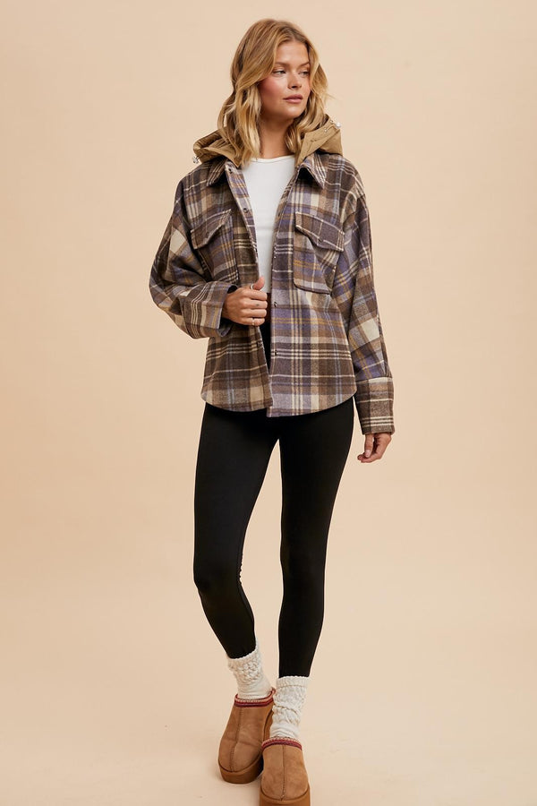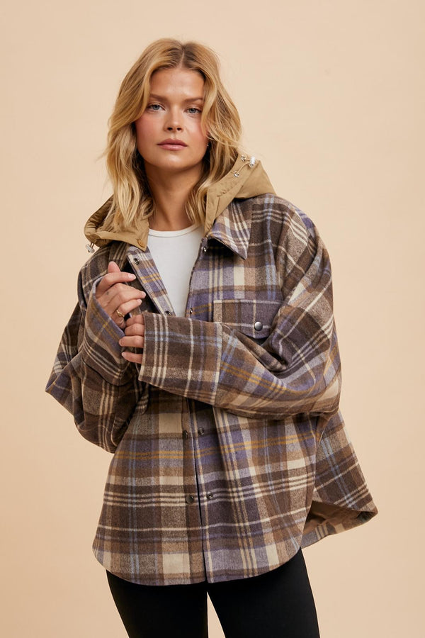 Your new obsession just arrived—the Stick Season Jacket, where versatility meets adorable style. Packed with practical details like double breast pockets with button closures, functional metal snap buttons, and cuffed sleeves, this plaid jacket means business. The fully lined interior (yes, even the sleeves!) keeps you wrapped in warmth, while the detachable padded waterproof hood adapts to whatever weather decides to show up. Feeling shacket energy? Simply unsnap the hood and rock a whole new vibe. Crafted from thick, warm plaid fabric in a loose, relaxed fit, it's the casual, cozy, trendy piece that'll become your go-to for everything. Available in camel or slate—pick your poison and prepare to layer like a boss.