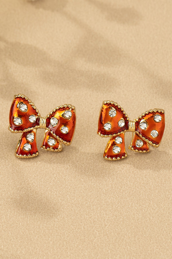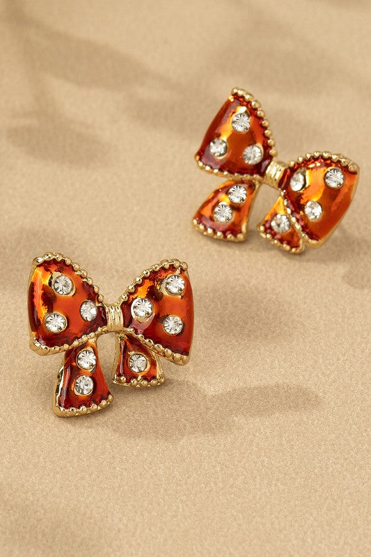 Add a fun and glamorous flair to any look with these enamel bow stud earrings, available in bold black with clear rhinestones or vibrant red with golden accents. Each pair dazzles with sparkling stones and delicate gold beading, creating a charming, standout accessory. Lightweight and versatile, these earrings are perfect for brightening festive outfits, gifting, or adding a touch of playful sparkle to your everyday style. Mix and match to suit your mood!