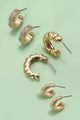 Get ready to sparkle with the Time To Shine Huggie Hoop Earring Trio! This fabulous set brings three pairs of textured huggie hoops, each one decked out with dazzling rhinestones for that extra glam factor. Mix and match the geometric designs or wear them individually—you're in control of the vibe. Crafted with hypoallergenic titanium and surgical steel posts, these lightweight beauties are gentle on sensitive ears while staying put all day long. Gold-plated with double E-coating protection, they're built to keep shining through all your adventures.