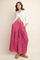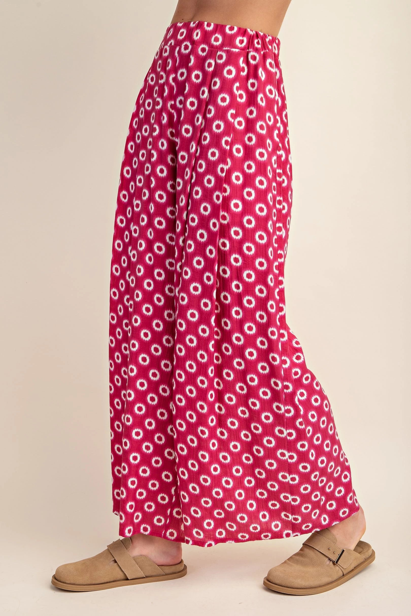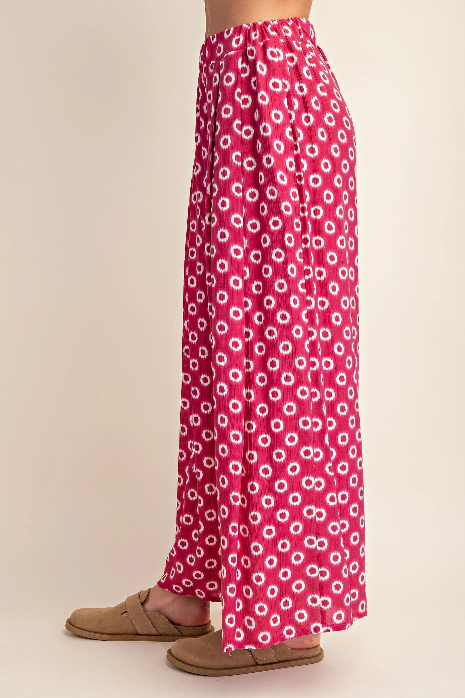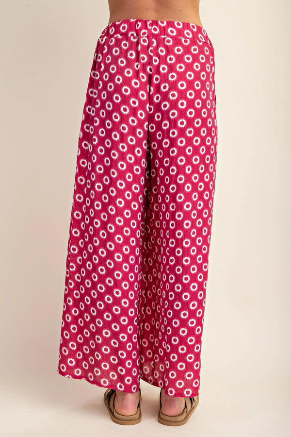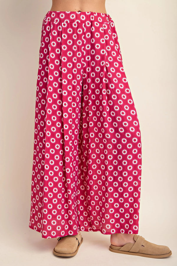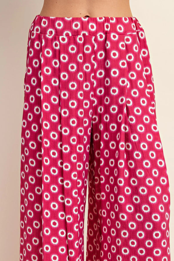 Make an entrance in these Vanessa Wide Leg Pants, where bold fuchsia meets playful style. The eye-catching white circle print dances across a vibrant base, while pleated detailing and a flowy silhouette create an elegant skirt-like effect. Elastic waist and hidden side pockets deliver comfort without compromise. Dress them up with a crisp white blouse for the office or weekend brunch, or keep it casual for beachside adventures. Perfect for spring.