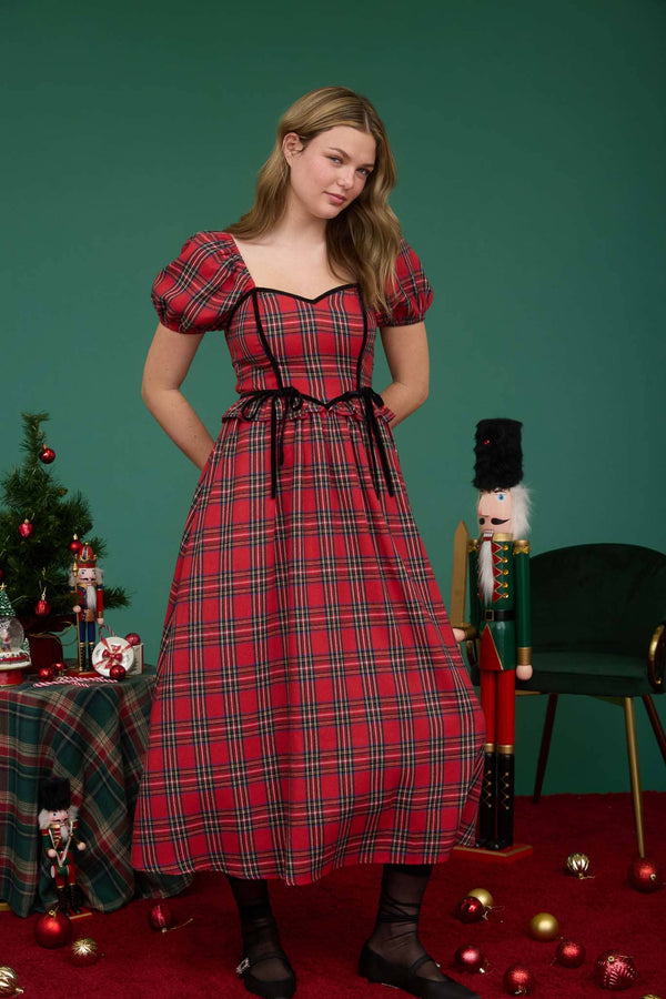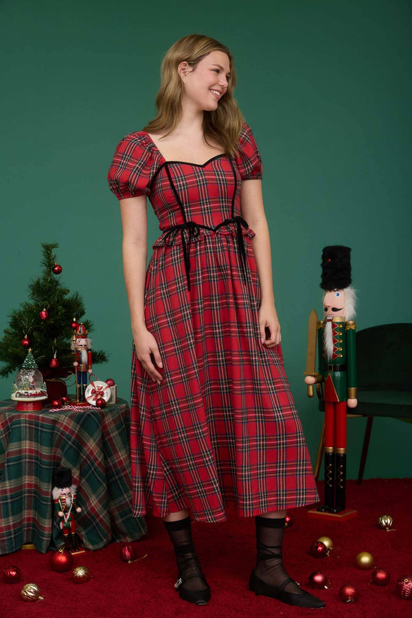 Twirl into the season in this show-stopping red plaid midi dress! Featuring a charming sweetheart neckline and delicate short puff sleeves trimmed in luxe velvet, this festive number is designed to turn heads at every holiday celebration. The back smocking and ruffle waist detail add playful dimension, while a velvet ribbon bow tie brings that extra touch of elegance. Fully lined for comfort, this midi beauty transitions seamlessly from office parties to Christmas services. Your holiday wardrobe just got a major upgrade!