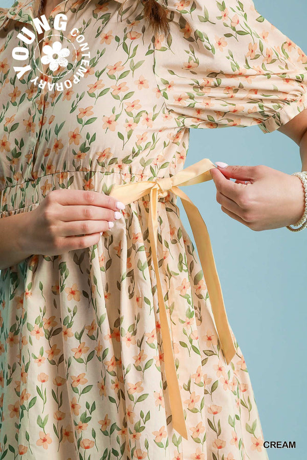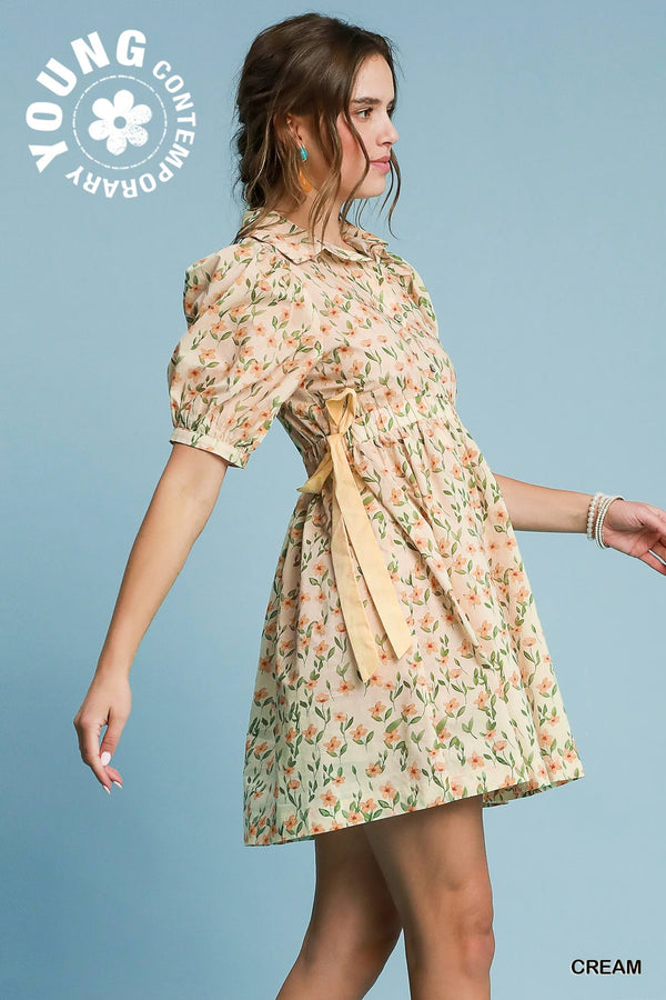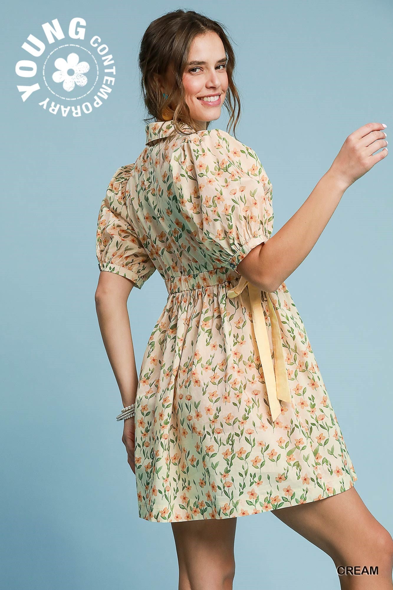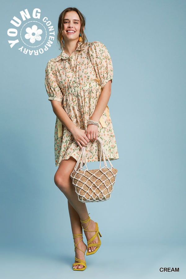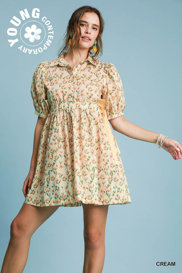Celebrate the season in this delightful Spring Bloom Dress. A cream mini dress adorned with a cheerful yellow floral print. Romantic puff sleeves with elastic cuffs frame the shoulders beautifully, while the smocked waistline offers a flattering, feminine silhouette. Adjustable yellow ribbon tie details on the sides let you customize your fit with ease. Unlined for breathable comfort. Whether you're dressing up for Easter, Mother's Day, graduation, or simply embracing spring style, this charming dress brings girly elegance to every occasion.