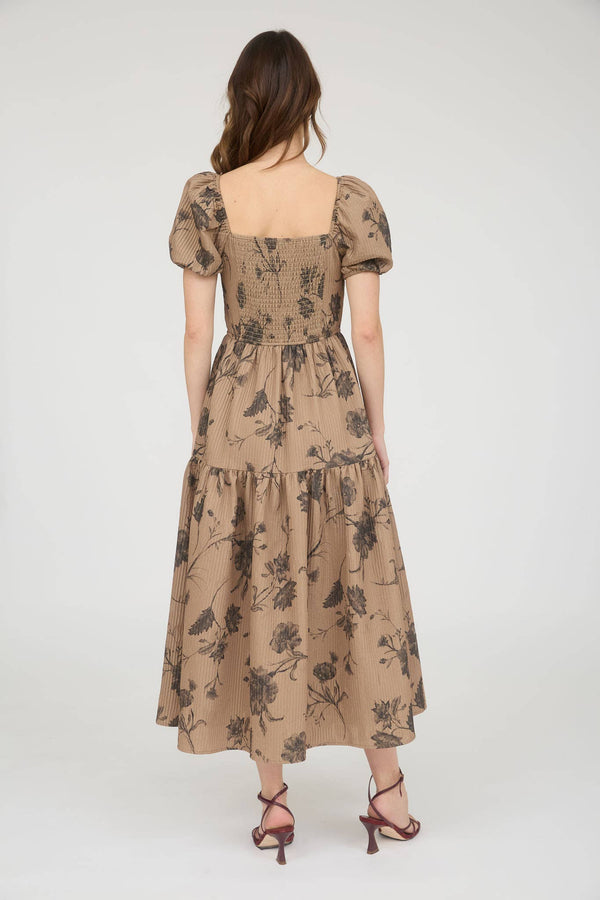 Embrace the season with the Autumn Romance Midi Dress, featuring a sweet sweetheart neckline and charming short puff sleeves. The corset detail and back smocking create a flattering fit, while the A-line silhouette with a ruffle hem adds playful movement. Its khaki base with textured floral print makes it perfect for fall weddings or special events where you want to feel effortlessly romantic.