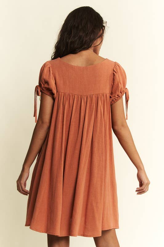 Embrace autumn vibes in the Cinnamon Spice Dress, made from a soft washed linen blend that feels as good as it looks. Featuring a charming square neckline, playful bubble sleeves with tie details, and two handy side pockets, this flowy dress is perfect for twirling through fall weddings, family photos, or any special occasion that calls for effortless style and a dash of fun.