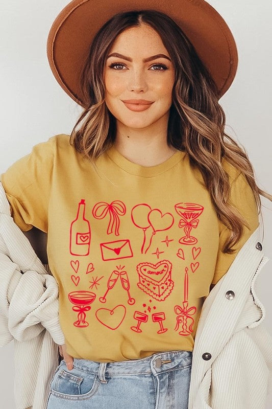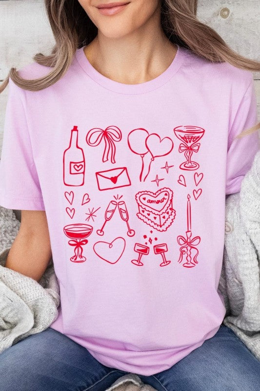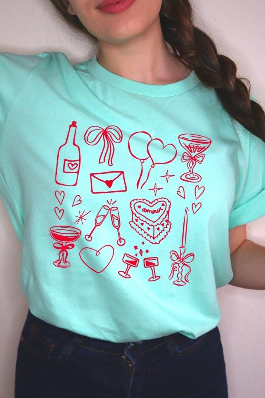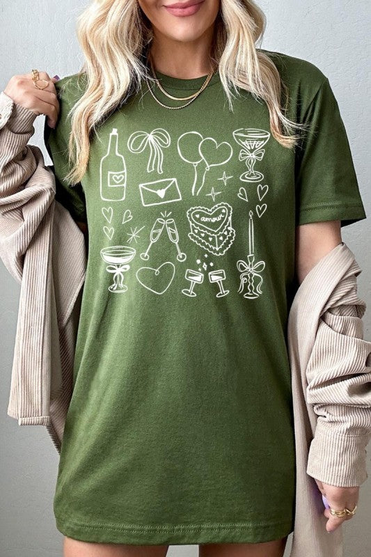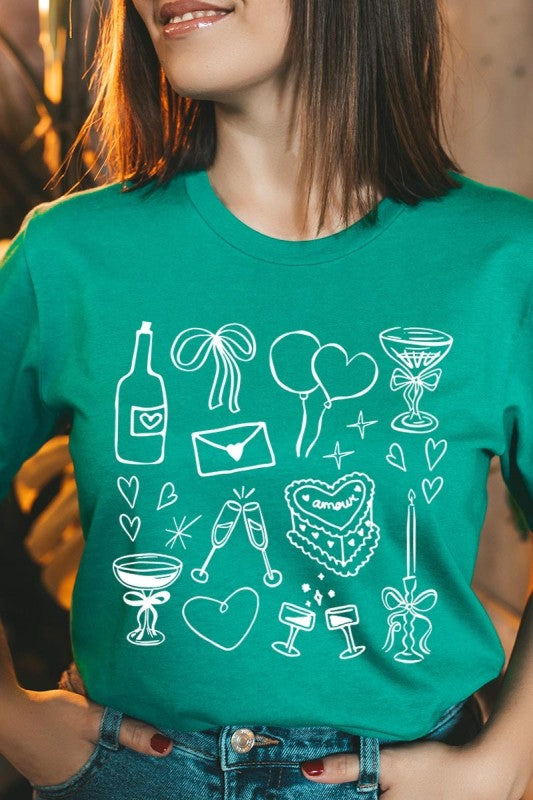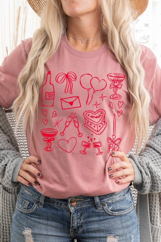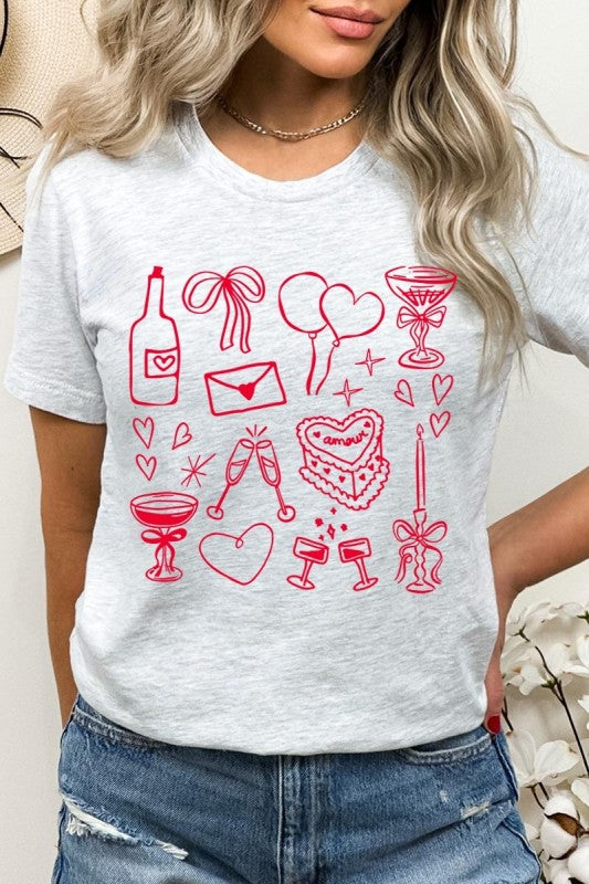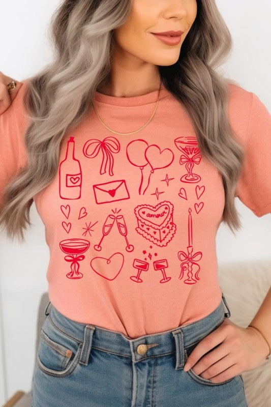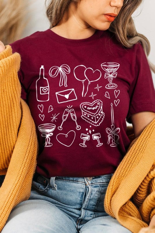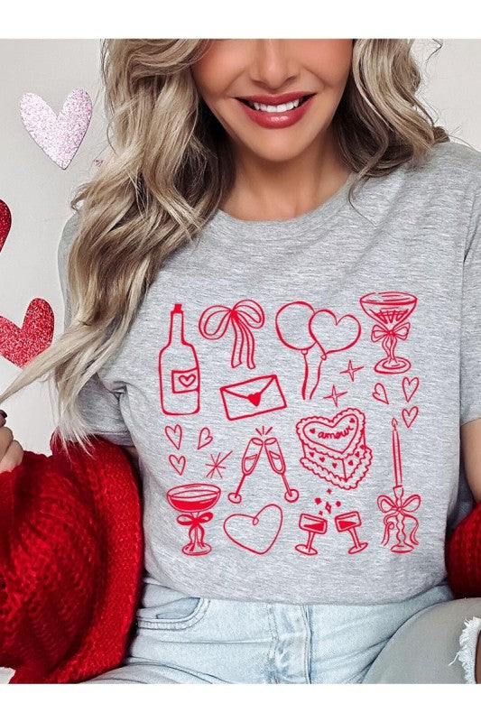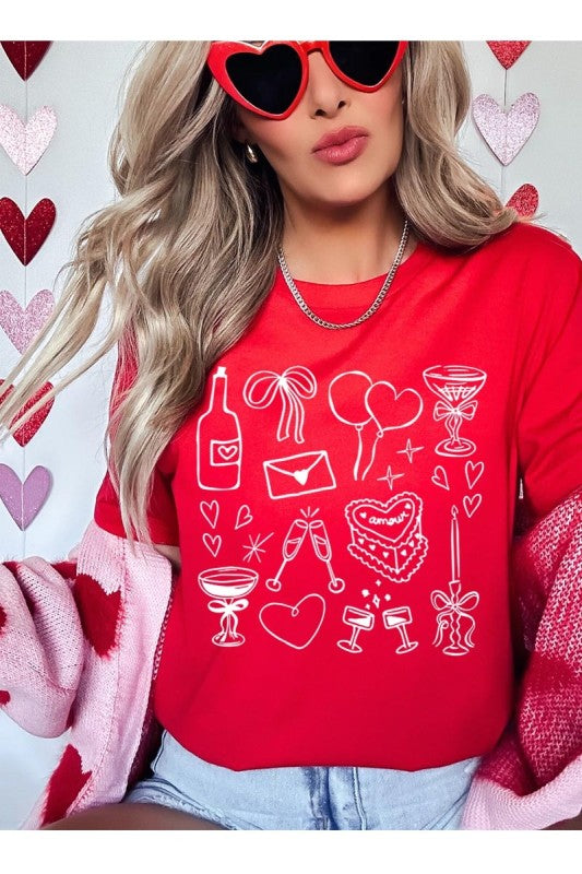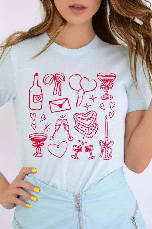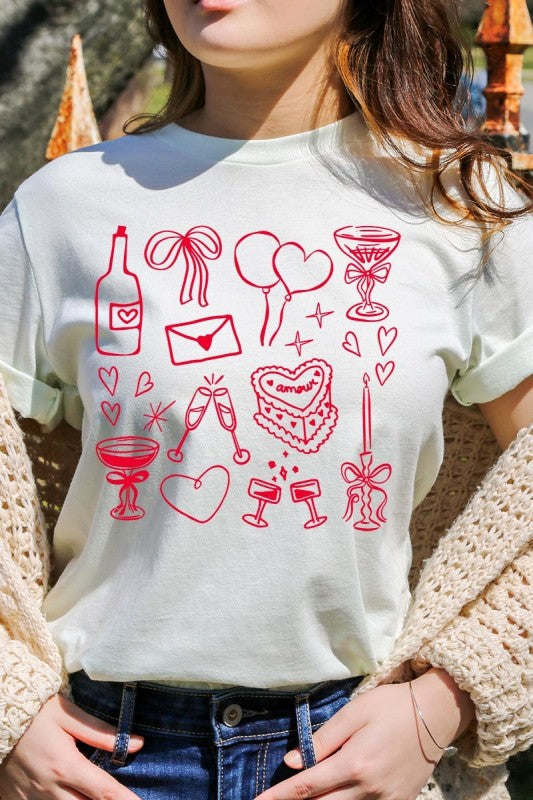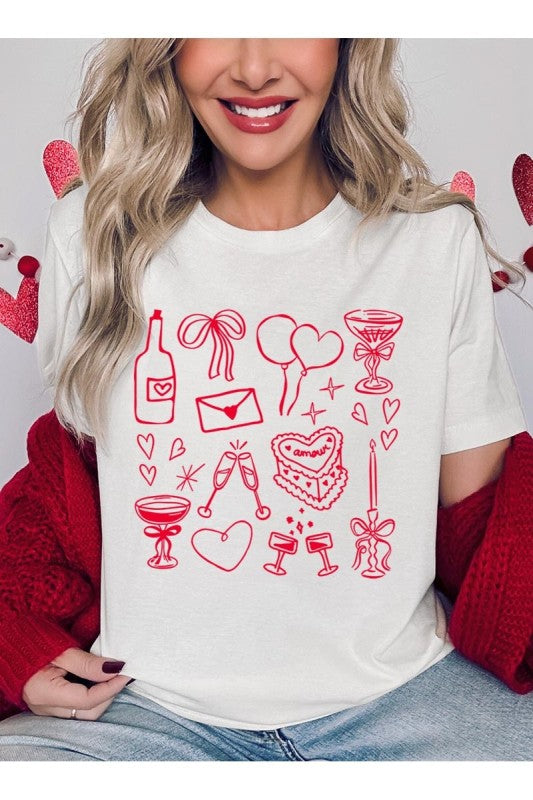 valentine doodle shirt, cocktail valentine icons tee, romantic sketch graphic, hand drawn hearts and drinks shirt, cute february shirt, girls night valentine tee, boutique aesthetic graphic tee, soft neutral valentine top, trendy love icons Graphic Tee.