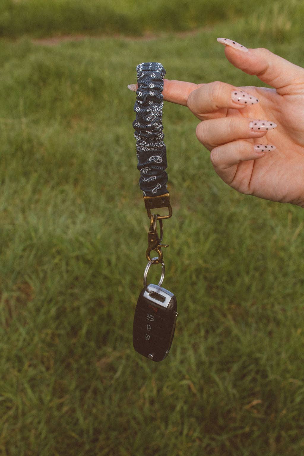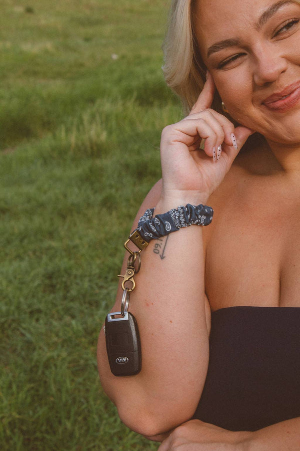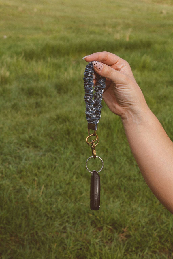 Andi keychains are the cutest you'll find! This keychain is the perfect navy in a paisley/bandana print. Get this to hold all your necessities and keep your pockets and hands free while adding a cute and stylish flair.