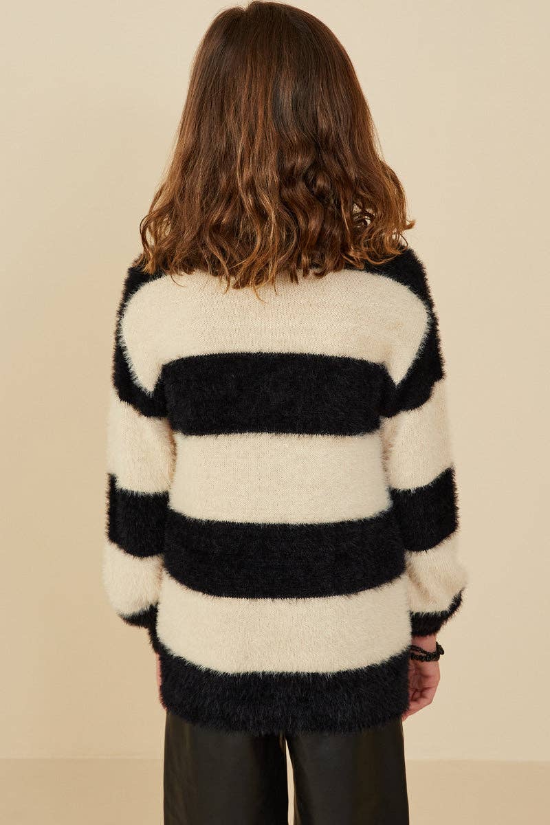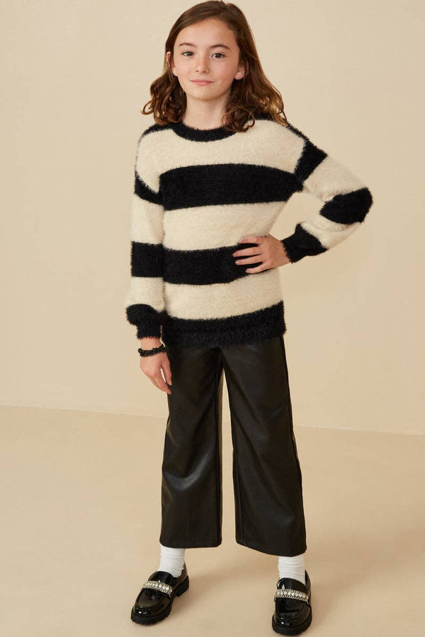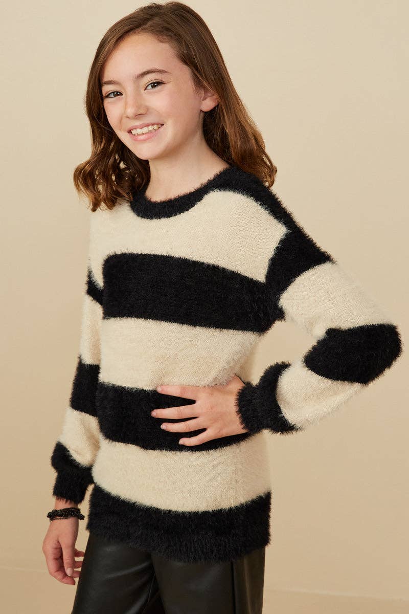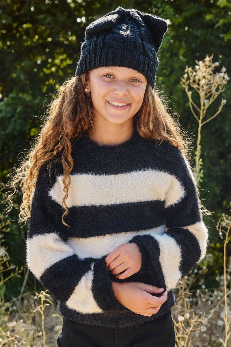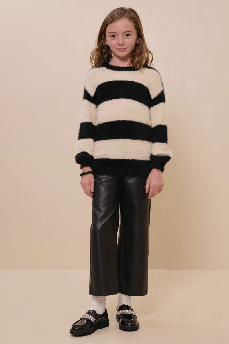 Get ready to take on the world in the Frankie Fuzzy Striped Pullover Sweater! This cozy layer brings the cool factor with its eye-catching striped woven fabric and ultra-soft eyelash knit texture. The classic round neckline and cuff sleeves give it an effortlessly edgy vibe that's totally on-trend. Whether she's hanging with friends or keeping it casual, this sweater delivers that perfect combo of snuggly comfort and fashion-forward style that tween girls are craving.