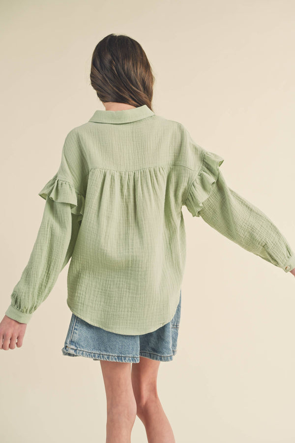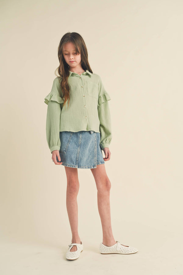 Introducing the Serena Top, a playful and stylish choice for young girls. This soft cotton top features a trendy drop shoulder design, ruffle detail, and a charming soft sage color. Perfect for any season, it's a must-have for spring layering and makes a great addition to any tween's closet!
