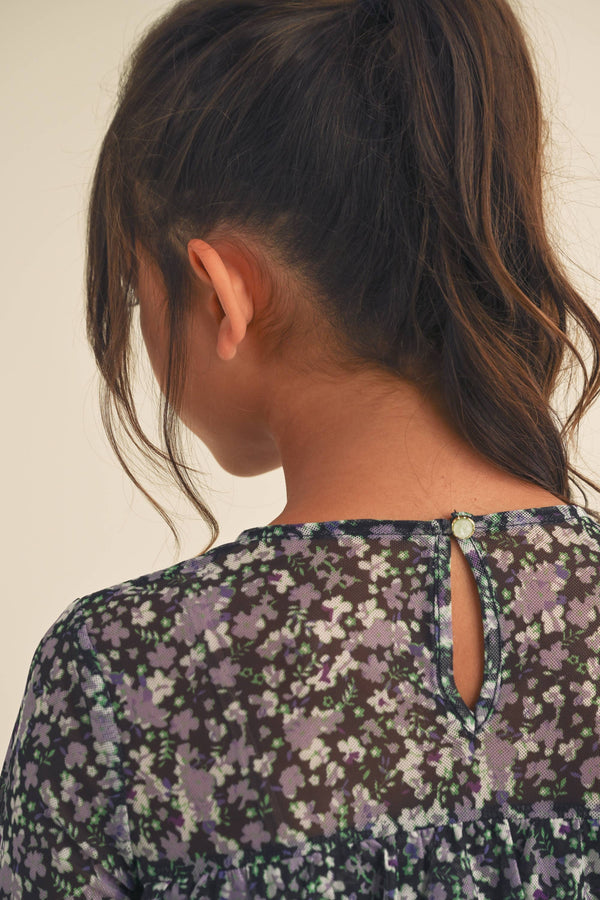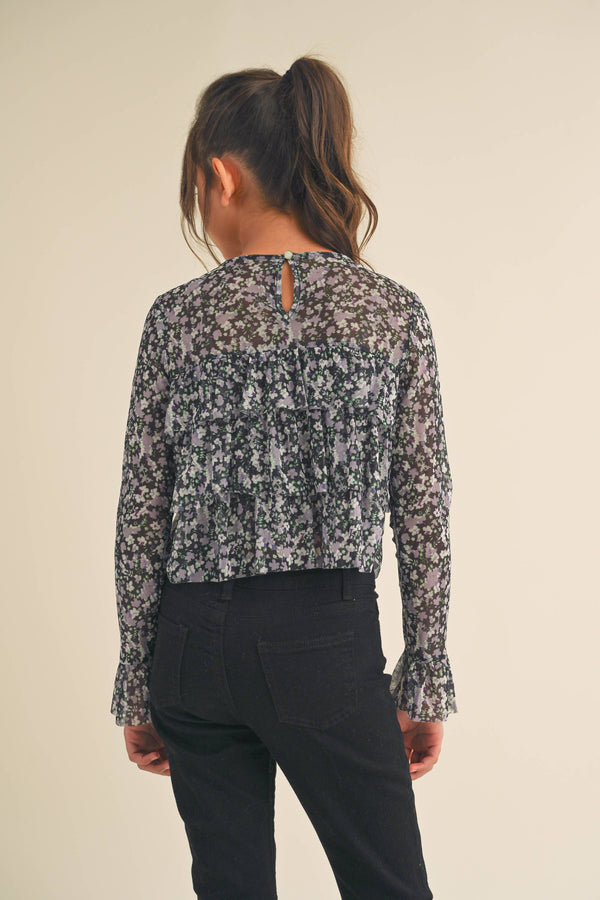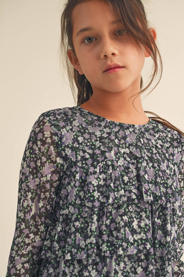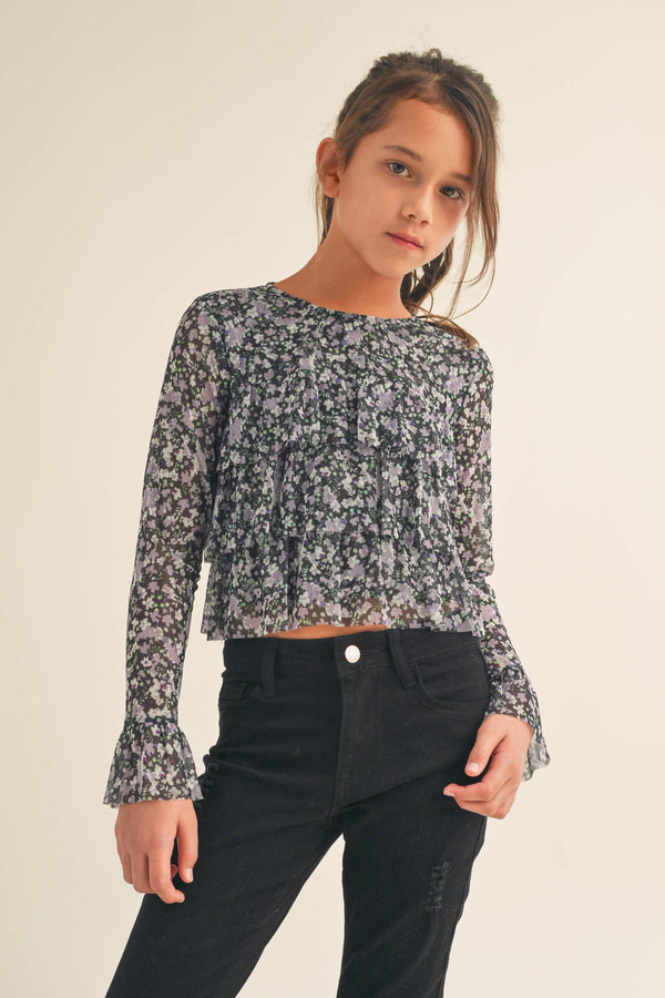Introducing the Tilly Tiered Mesh Top - a must-have for any young fashionista. This adorable ruffle top is versatile and can be paired with any bottom, from jeans to skirts. The flared ruffle sleeves and ditsy floral print add a touch of femininity. Perfect for layering or wearing on its own! (Girly and fun!)