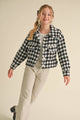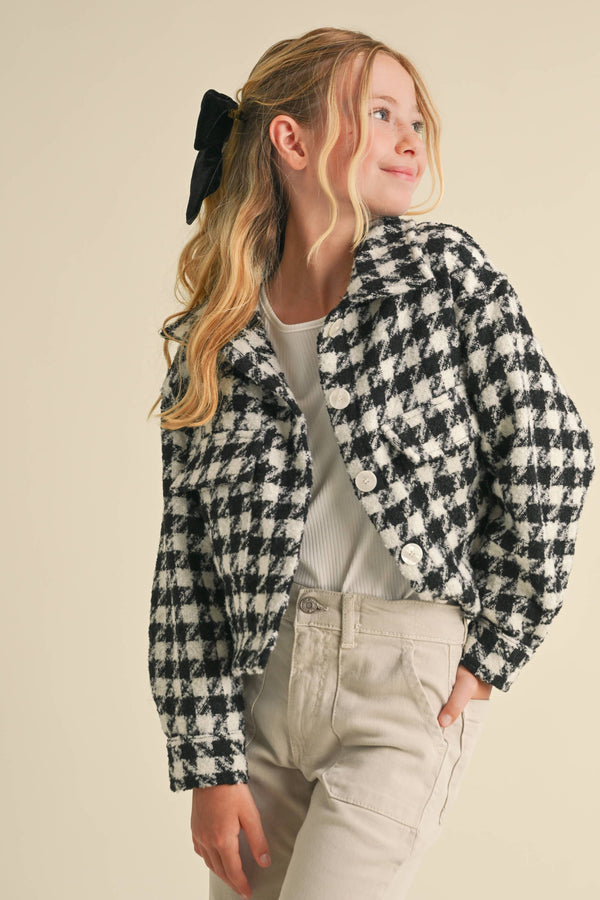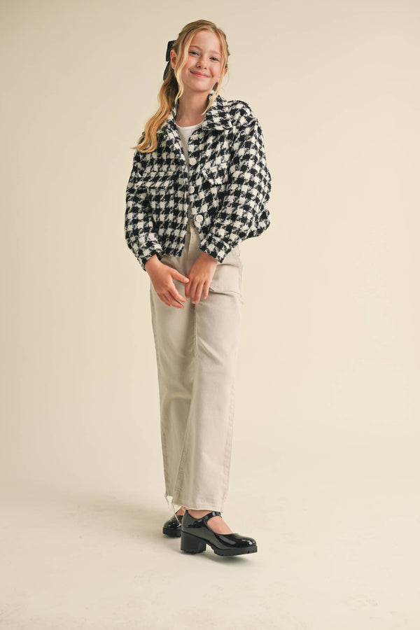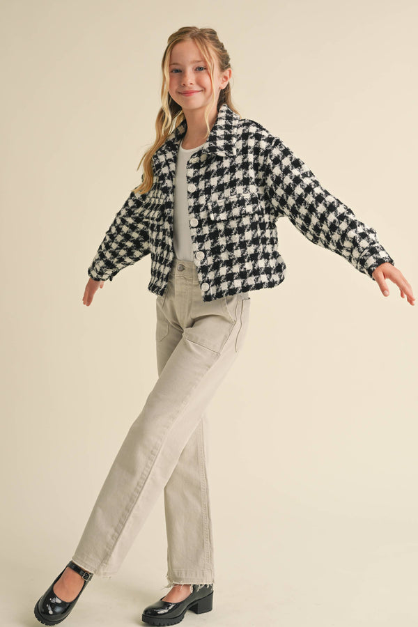 The Harlow Houndstooth Jacket is perfect for the stylish and fun-loving girl. Its boucle tweed material and houndstooth pattern make it suitable for various occasions, from travel to school to family outings. Stay comfortable and fashionable with this jacket! wonderful choice for kids in daily life.