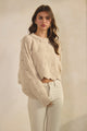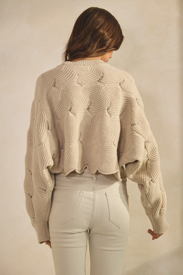 The Sandy Swirl Sweater is your new cozy essential. Featuring a relaxed fit and playful scalloped pattern, this rib knit pullover in a soft neutral sand shade adds charm to any outfit. Its unfinished hem and cropped length make it easy to layer—dress it up with a skirt or slip it over a dress for a flirty twist. For chill days, pair it with your favorite denim or leggings and let comfort meet cuteness effortlessly.
