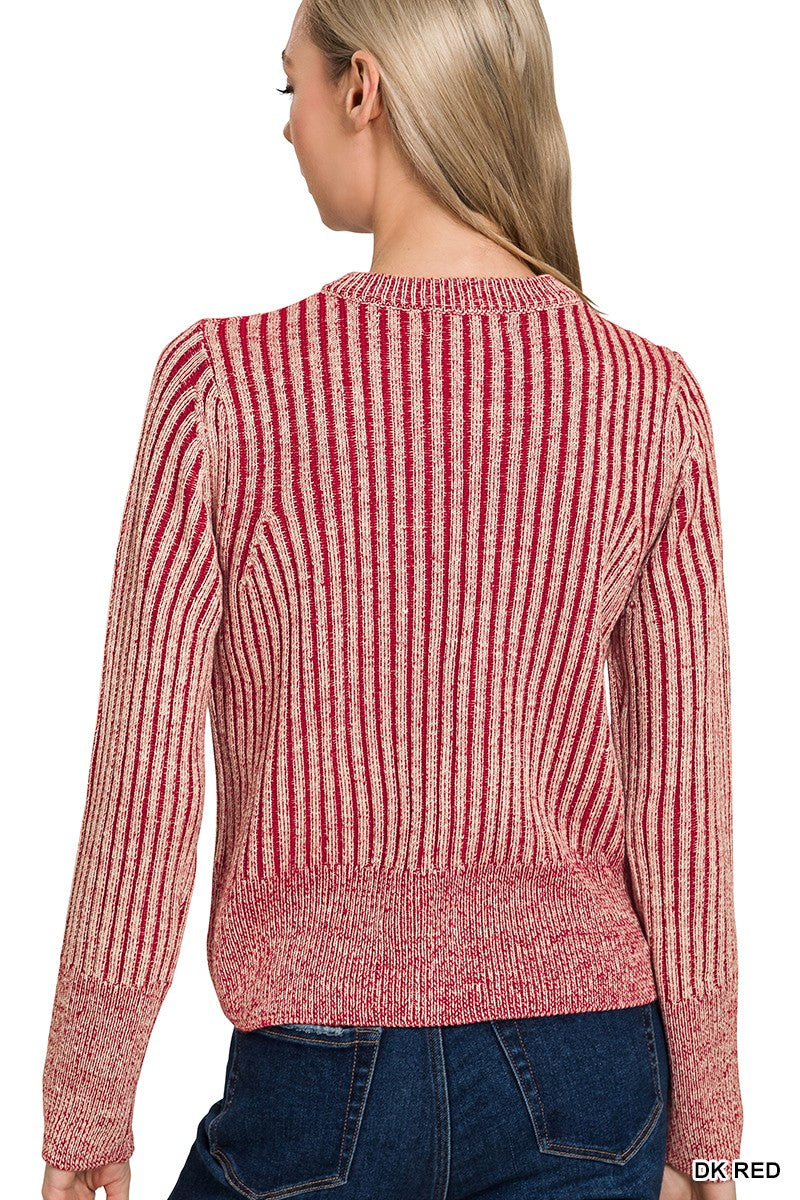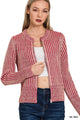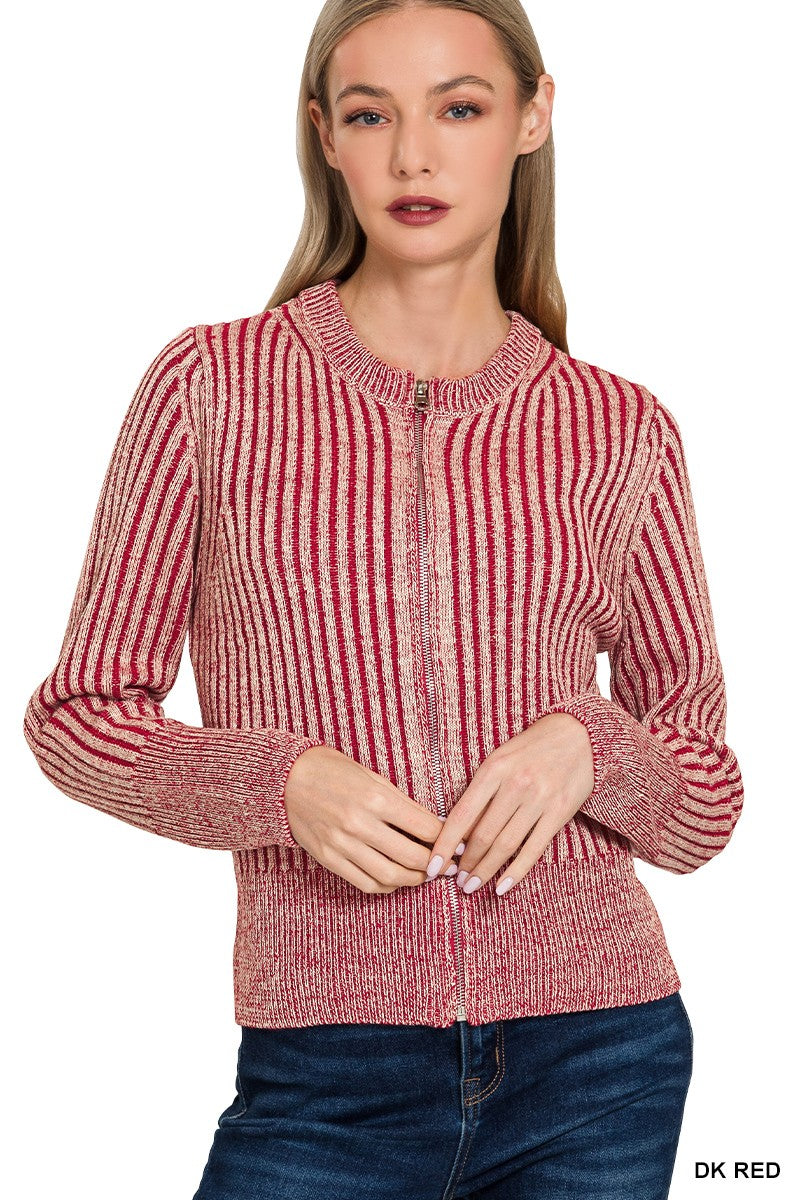 Stripes meet style in this two-tone zip-up sweater that's ready for anything. Deep ribbing creates a fun striped visual effect, while the tight knit delivers a flattering fitted silhouette. Layer it open over your favorite holiday graphic tee for effortless charm, or zip it up for that sleek, polished look. Available in rich dark green or deep dark red—your new go-to piece for festive flair and everyday versatility.