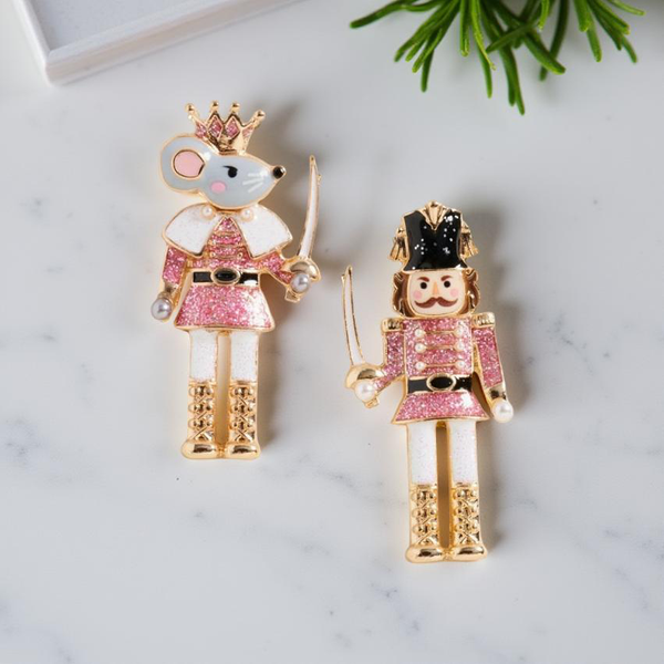 These expertly crafted drop earrings bring the classic Nutcracker and Mouse King duel to life in a playful way. One earring features the Nutcracker, the other the Mouse King, with their bodies charmingly dangling from their heads. A delightful accessory to add festive fun and timeless storytelling to your style.