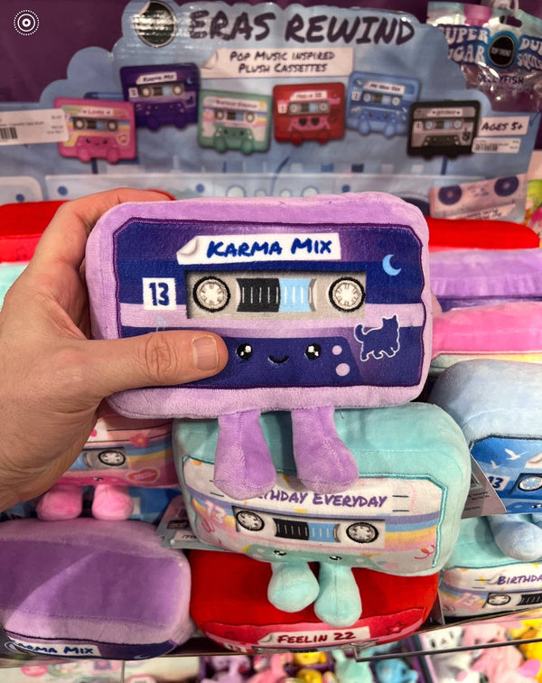 Celebrate your love for iconic musical eras with Eras Rewind, a collection of mini plush cassettes inspired by the colors, vibes, and unforgettable energy of timeless albums and moments. Each cassette features unique designs like “Karma,” “Feeling 22,” “Birthday Everyday,” “Lover,” “Getaway,” and “My New Era,” capturing the essence of eras that have defined a generation. Measuring 6.5”W x 3”D x 4”H, these soft, collectible plush cassettes are perfect for fans who love to relive their favorite eras in a fun and stylish way.