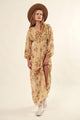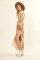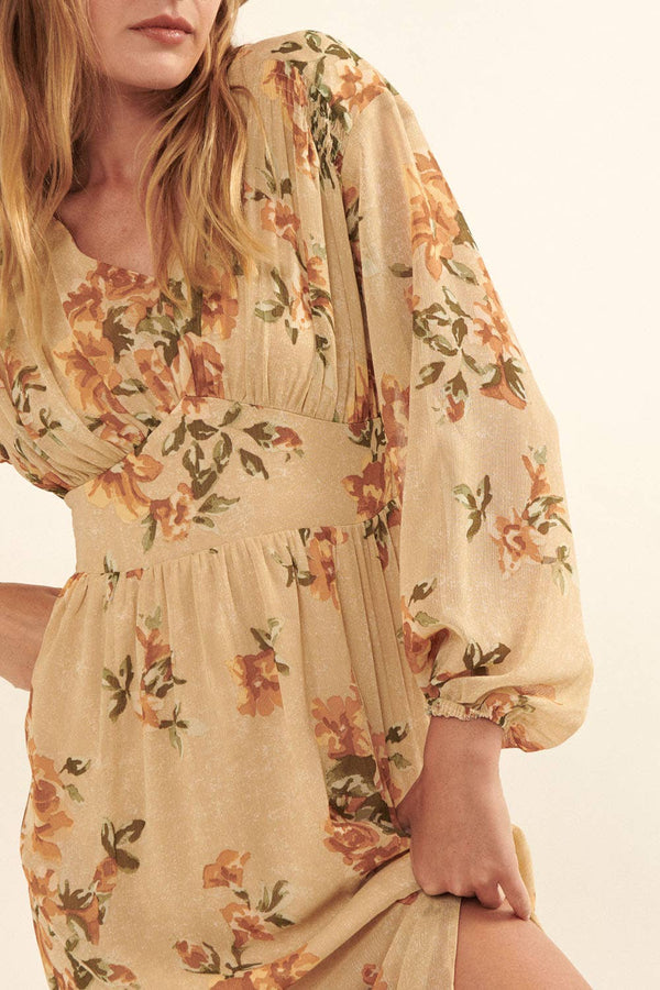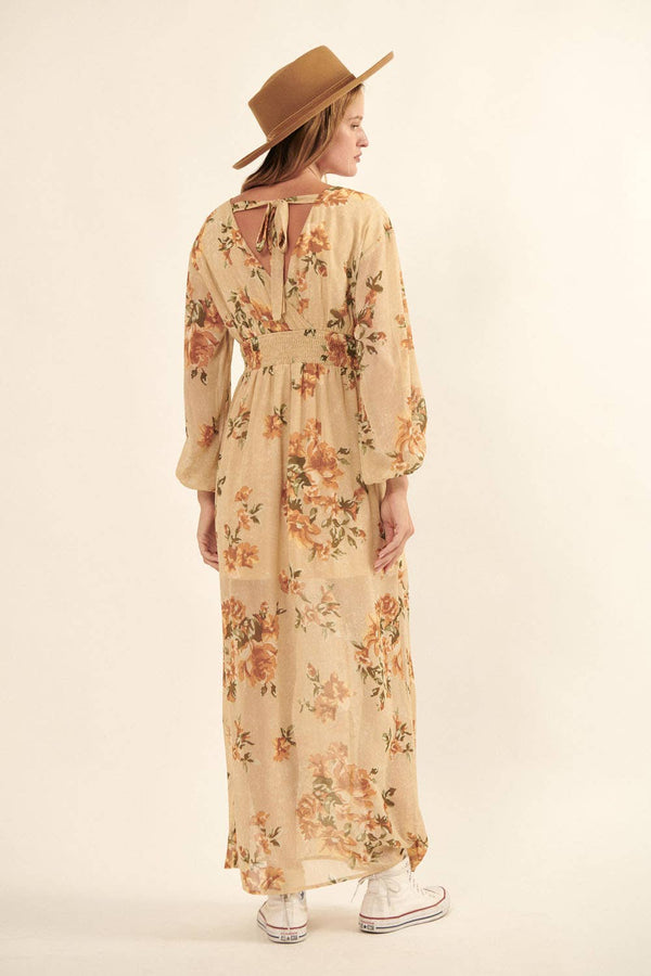 Step into a garden of dreams with the Whimsical Romance Maxi Dress. This chiffon beauty features a flirty V neckline, gathered bodice, and long bubble sleeves with elastic cuffs for a playful touch. The smocked shoulders and elastic-back waist ensure a comfy fit, while the wide waistband and side slit add a dash of drama. In soft mocha with green and terracotta florals, it’s perfect for wedding guests or family photos that need a sprinkle of romance and whimsy.
