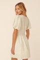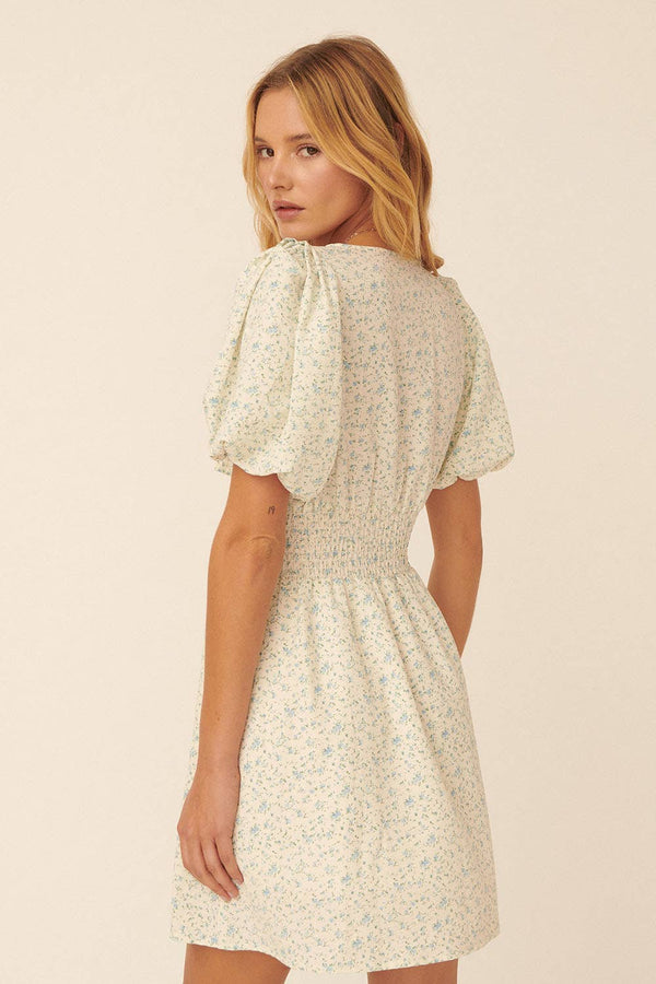 This charming mini dress features a delicate blue floral print on crisp white fabric. With a playful V neckline tied just right, short puff sleeves, and a smocked empire waist, it creates a flattering fit-and-flare silhouette. Perfectly dainty and feminine, the Misty Meadows Dress is ideal for bridal or baby showers, adding a sweet and stylish touch to your special day.