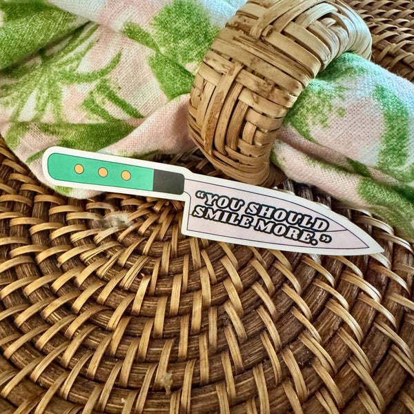 Our knife-shaped vinyl sticker serves deadly sarcasm with a mint green handle and the quote “You should smile more.” engraved on the blade. It’s 3 inches of waterproof, scratch-resistant fury with a split/crack back for easy application.