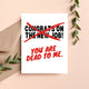 Congrats on the new job! You are dead to me." Perfect for sending off a colleague with humor and sass. Each A2-sized card (4.25in x 5.5in) comes with a kraft envelope, is wrapped in a cello sleeve, and is sold in packs of 3.
