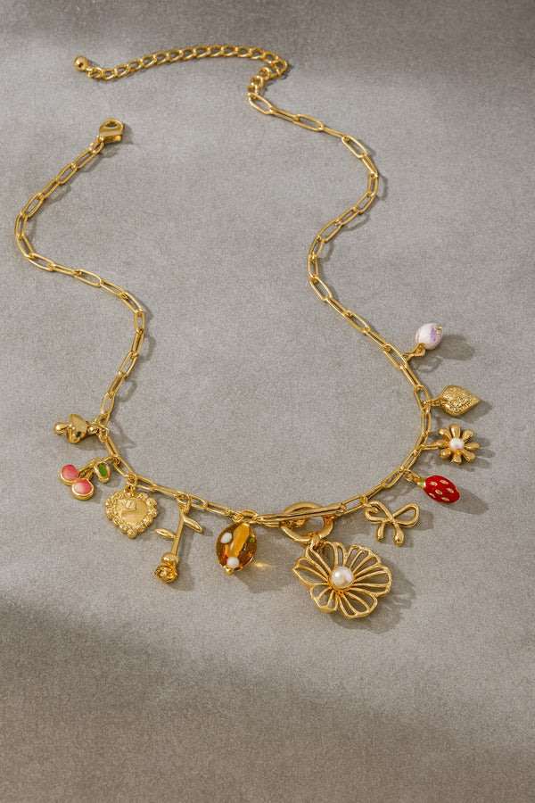 Celebrate nature’s charm with the Garden Glory Charm Necklace. Its gold paperclip chain showcases a delightful mix of floral and fruit charms—including a pearl-centered daisy, red enamel and pink Murano glass strawberries, butterflies, cherries, and a tiny rose. Enamel and crystal accents add sparkle and personality, making it a playful and elegant accessory. Perfect worn alone or layered, its adjustable extender ensures a comfy, customizable fit for every free spirit and garden lover.