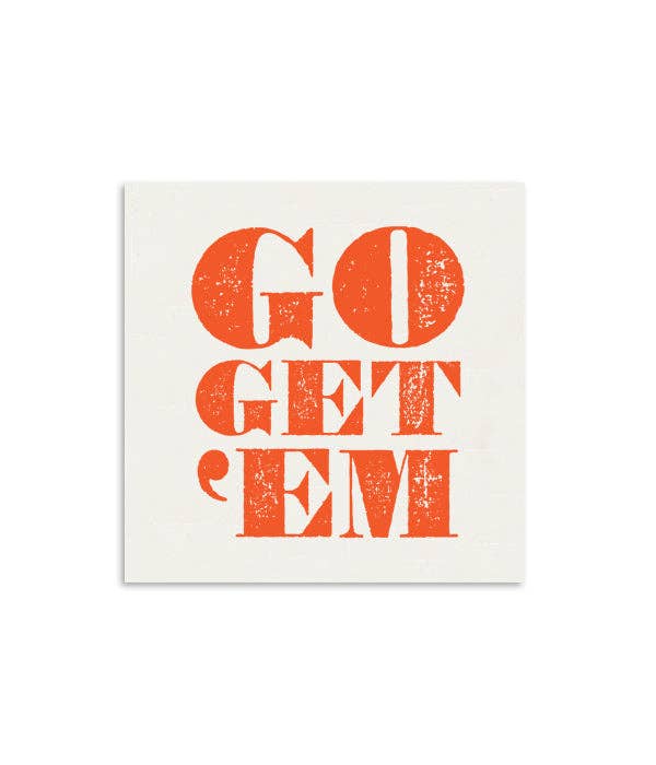 Go Get 'Em Mini Notecard Perfect for small gifts, flower arrangements or to frame as art. Size: 3" by 3" folded Material: Each card is printed on 100lb French Madero Beach cover stock with a white envelope. Inside: Blank for your sassy-ass message. Color: Natural White ------------------------------------------- Made in Nashville, Tennessee • Sass and Spunk included. Tiramisu Paperie • © 2017 • All rights reserved