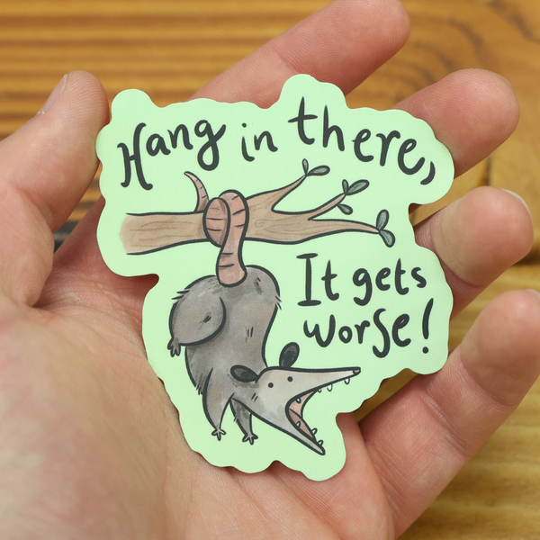 Life’s a mess, and no one gets it like this screaming opossum. Our "Hang In There" funny vinyl sticker is the perfect sassy reminder that sometimes you just have to scream through the chaos and keep going. Stick it where you need a little tough love and a whole lot of attitude to survive the daily grind. Because yeah, life sucks—but so do you if you don’t hang in there!