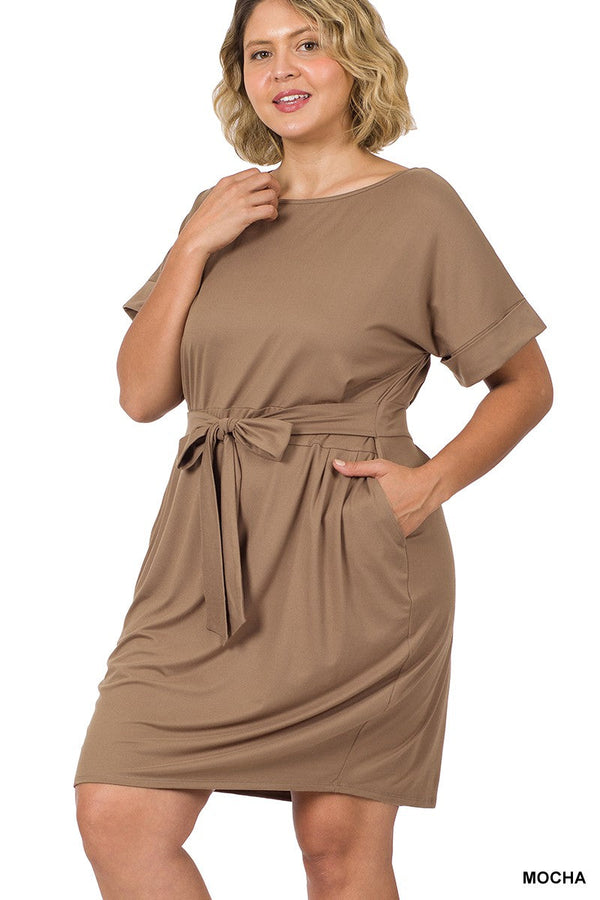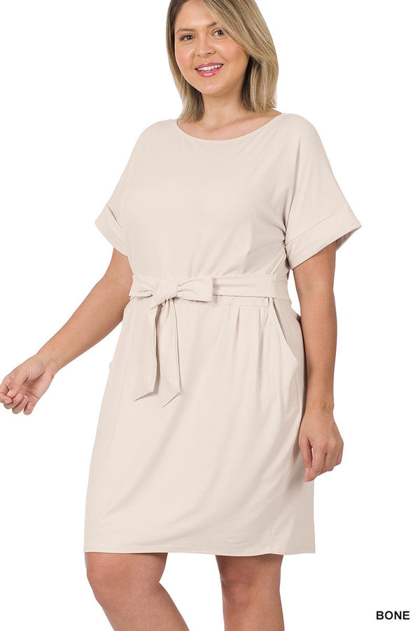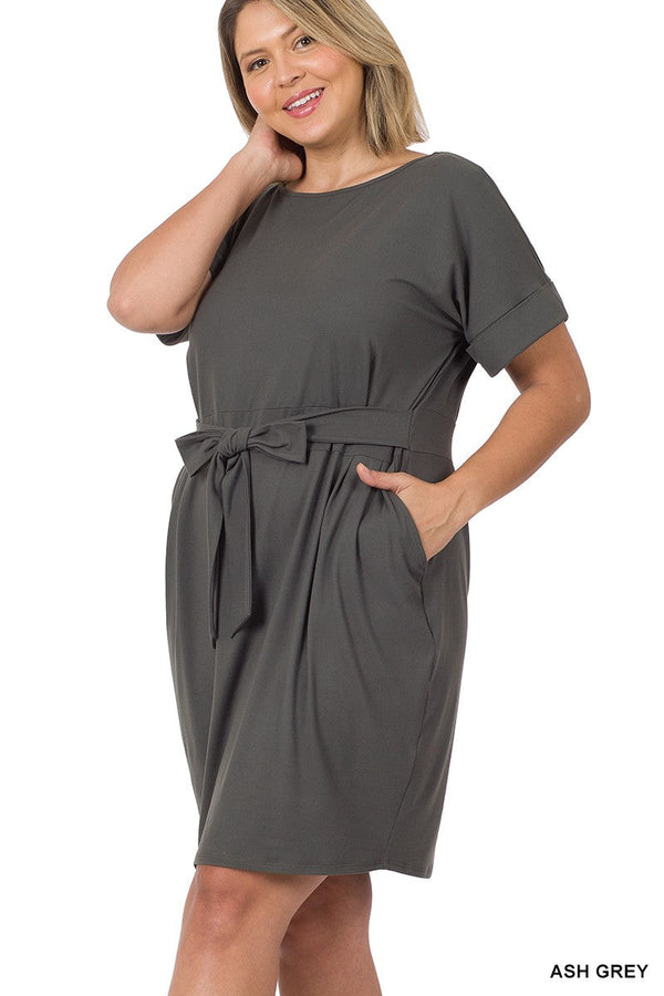 Say "hello" to the "Keep It Simple Dress"! Crafted with buttery-soft, brushed fabric, it's the upgraded basic perfect for every occasion. With a tie waist, boat neckline, pockets, and cuffed short sleeves, this knee-length dress is as comfy as it is stylish! Choose from Ash Grey, Bone, or Mocha for your go-anywhere look. Now that's what we call keeping it simple!