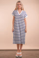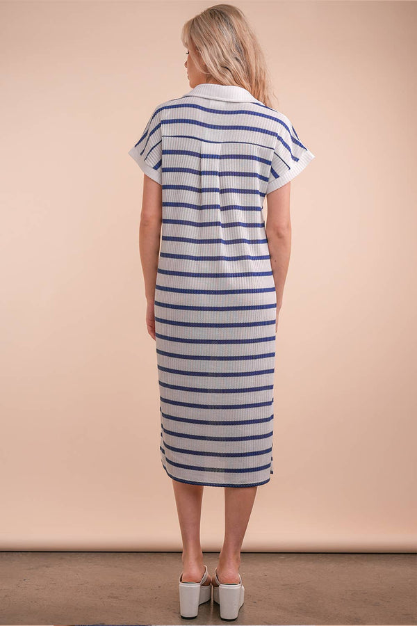 Set sail in style with the High Seas Shirt Dress! This oversized, collared midi dress features playful navy and white stripes that bring a fresh, nautical vibe. The split neck and short folded sleeves add breezy comfort, while the side slit gives you just the right amount of flirtatious flair. Perfect for sunny days or casual evenings, this striped knit shirt dress is your go-to for effortless charm and laid-back fun.