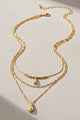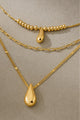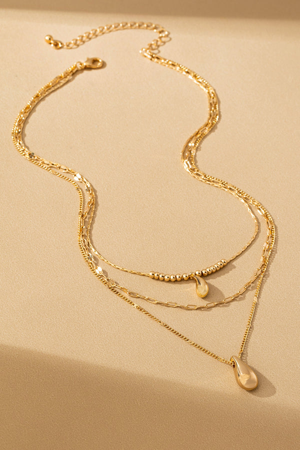 This playful layered necklace mixes three gold-tone chains—beaded, link, and box—for a lively, textured look. Each chain flaunts a polished teardrop pendant with a fun, molten twist. The cascading layers bring effortless style and movement, adding just the right shimmer to your outfit. Adjustable length means you can switch up your vibe anytime, making it a perfect go-to for both casual days and glowing nights.