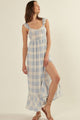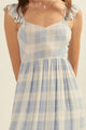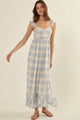 This playful powder blue plaid Picnic In The Park Maxi Dress features a sweetheart neckline and adjustable cami straps with charming ruffle details. Its open back with a drawstring closure adds a flirty touch, while the flared skirt with a ruffle hem and side slit creates graceful movement. The high waist and partial lining ensure a comfortable, relaxed fit. Perfect for showers or family photos, this dress brings feminine, girly vibes to any occasion.