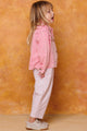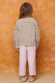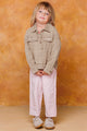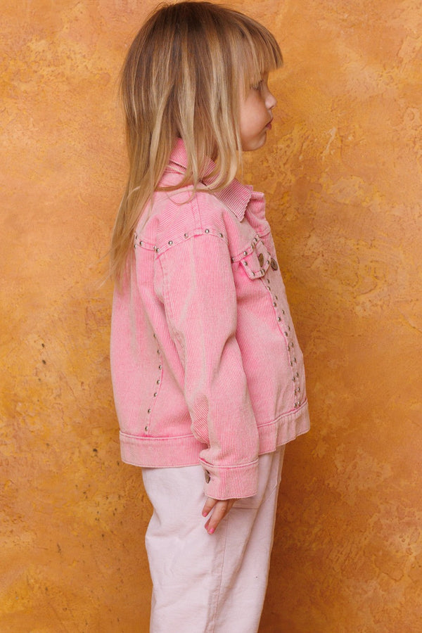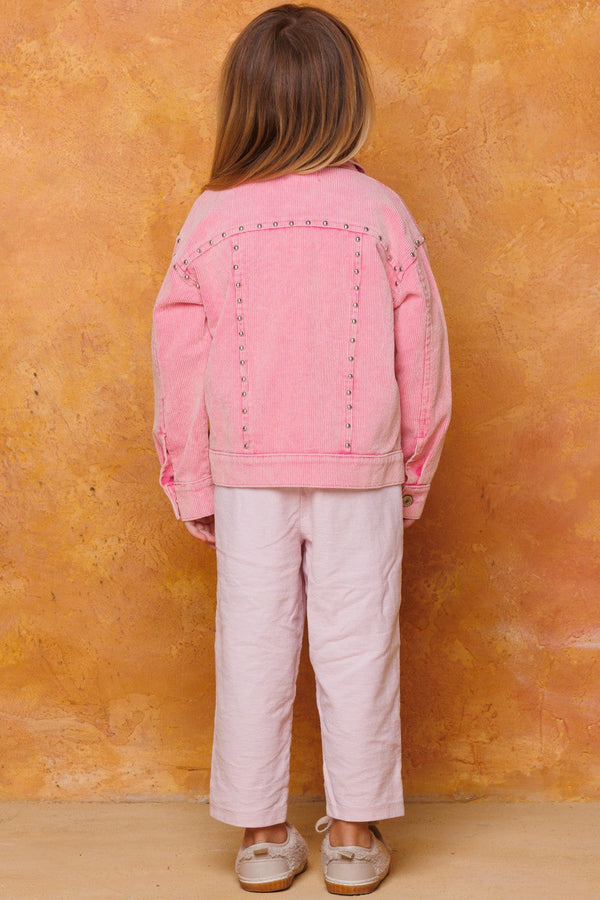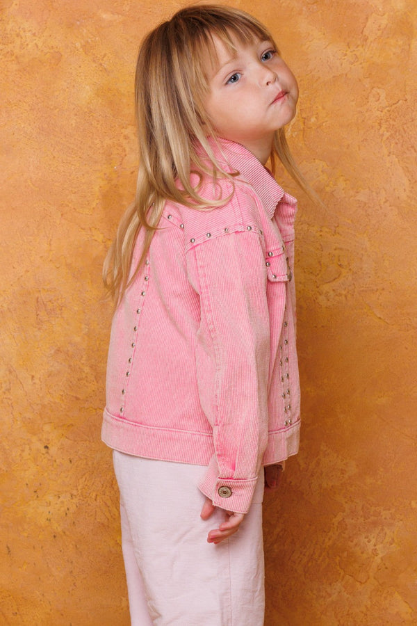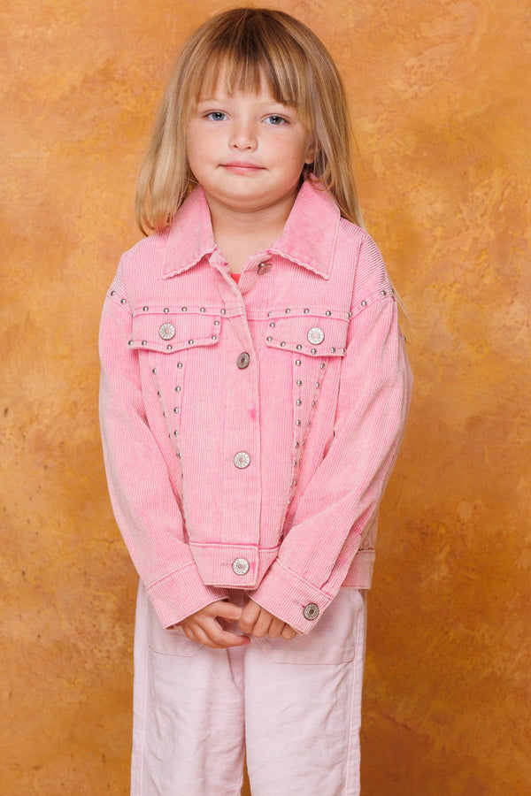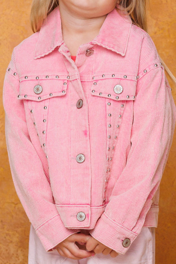 This stylish and comfy studded corduroy jacket is perfect for your little one! It comes in either a pink or taupe color and is washed to provide a soft feel. With a collared button-down and front pockets, your child can step into the day with confidence and style. Ready, set, wow!