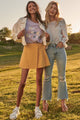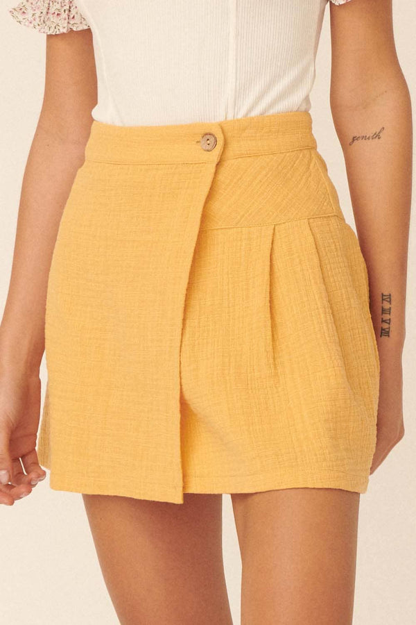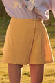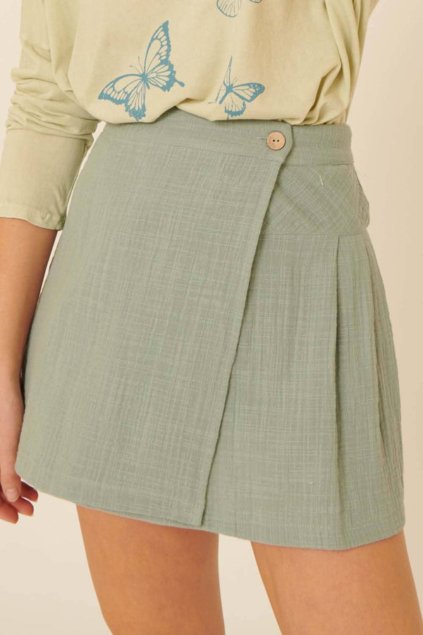 This playful mini skort features a banded waist and a buttoned wrap detail for easy style. The pleated back adds a flirty touch, while the shorts lining ensures comfort and coverage. Made from 100% cotton muslin, it offers a relaxed fit perfect for any occasion. Pair it with a graphic tee and sneakers for casual fun or dress it up with a blouse and strappy heels for a bit of glam. Available in Dusty Teal or Sunshine, this skort brings a fresh, trendy vibe to your wardrobe.