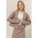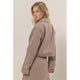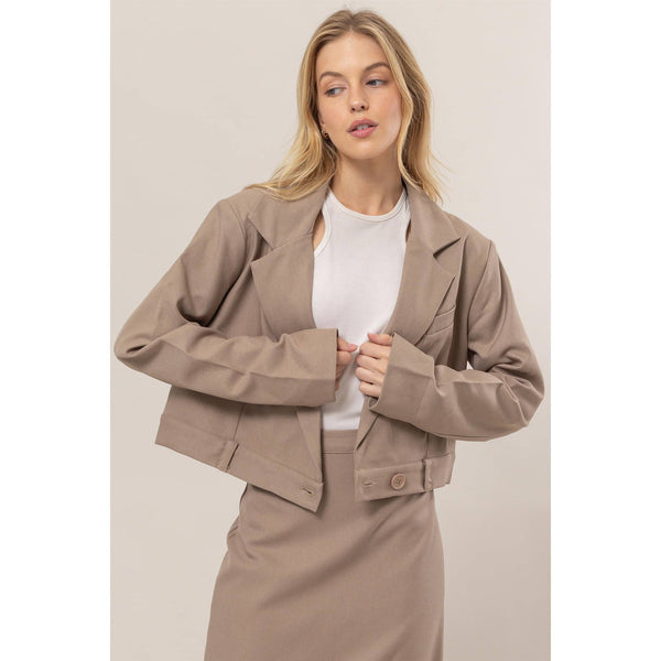 Meet your new wardrobe MVP! This cropped twill jacket is giving major style energy with its sharp collared neck, notched lapels, and polished long sleeves. The boxy bodice hits just right, fastened with a single front button and finished with a practical welt chest pocket and belt loops. In gorgeous taupe, it's the ultimate chameleon piece—throw it over your favorite denim for casual cool or layer it over a sleek satin dress for instant sophistication. Effortless, chic, and endlessly versatile.
