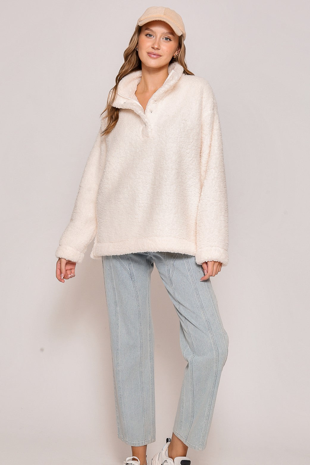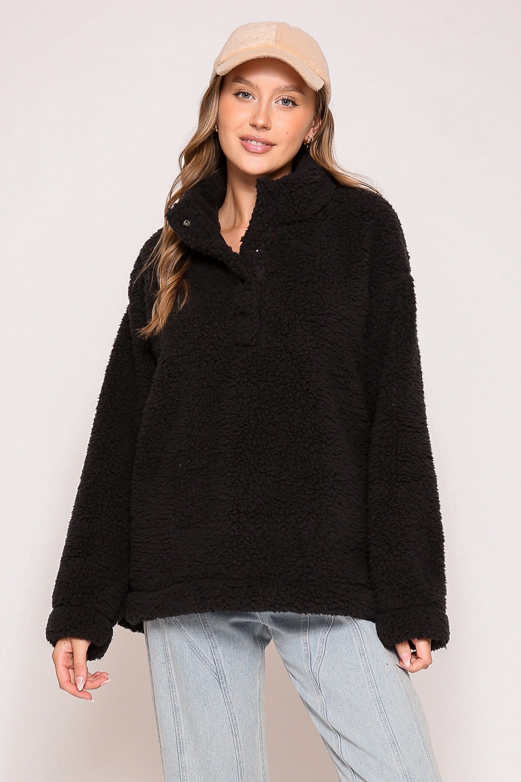 Wrap yourself in pure coziness with our Sherpa Jacket—the ultimate go-to for lazy days and casual vibes. Featuring a snug high collar and generously roomy sleeves, this pullover is basically a warm hug you can wear. Whether you're lounging at home or running errands, the soft sherpa lining keeps you toasty and comfortable. Pick your perfect shade from our trio of timeless colors: timeless Black, classic Cream, or pretty Pink. It's the jacket that says "comfort first, always."