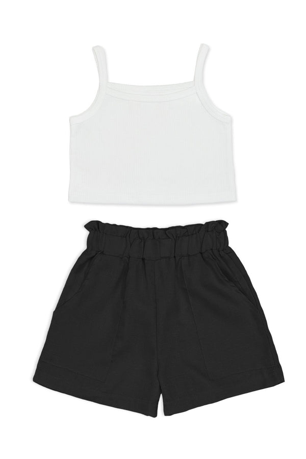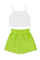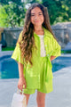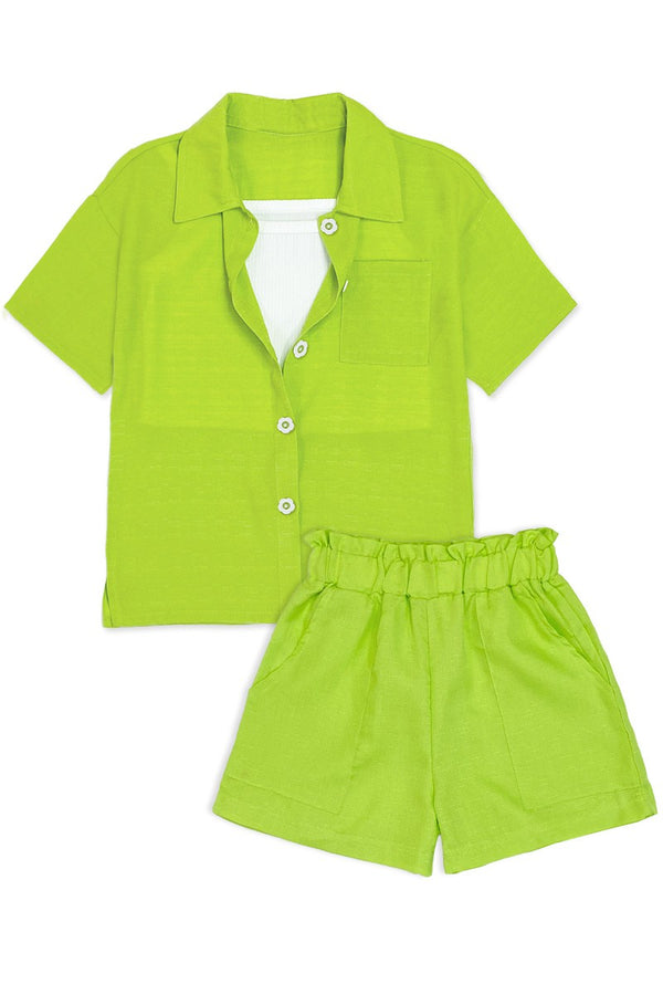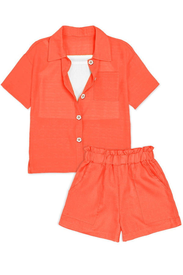 Spice up her wardrobe with our Fresh Fruit 3 Piece Set! Featuring an oversized collared top with flower buttons and pocket, a basic white tank, and elastic waistband shorts with patch front pockets, this set offers fun bright colors and unique details. Wear together or mix and match for endless style options!