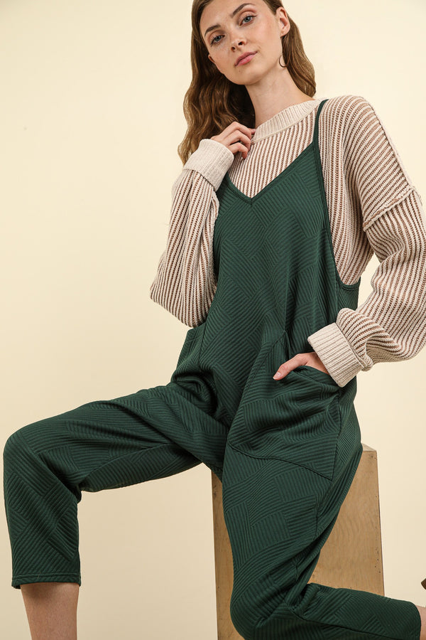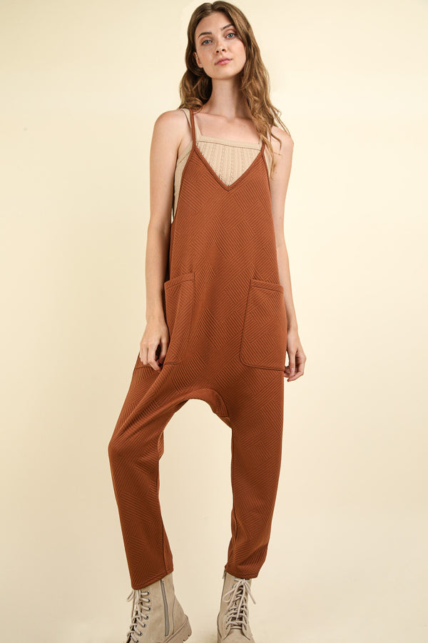 Get cozy and stylish this holiday season with our Friendsgiving Quilted Jumpsuit! Available in Black, Camel, or Forest, this jumpsuit features a quilted herringbone design, loose fit, and front pockets. The sleeveless design with spaghetti straps allows for easy movement, perfect for a Friendsgiving feast or Christmas movie marathon. Add a fun holiday graphic for a festive touch.