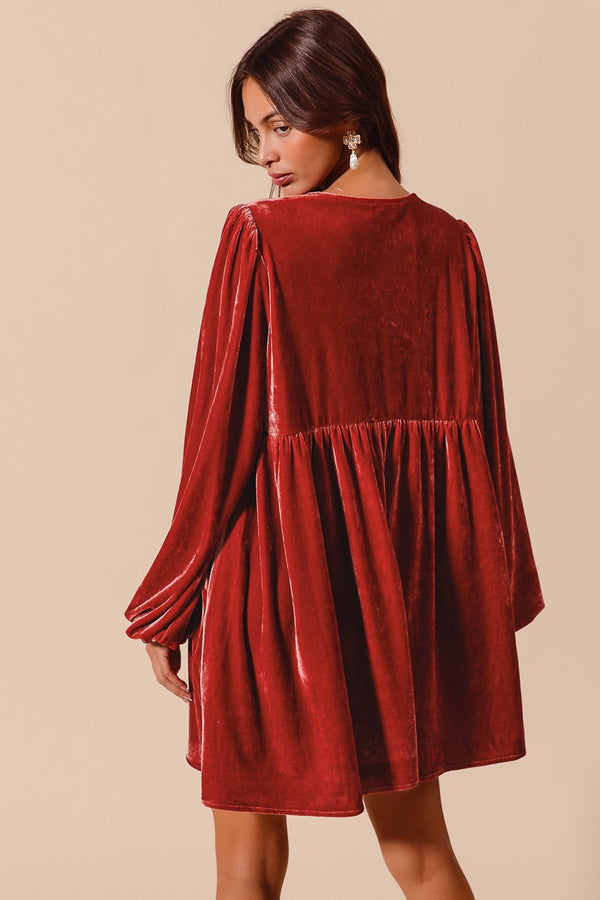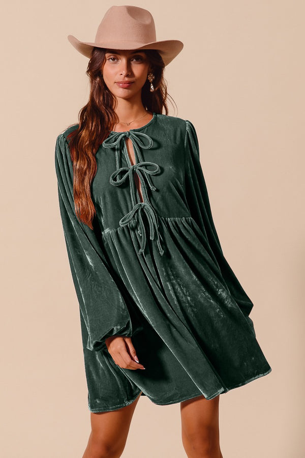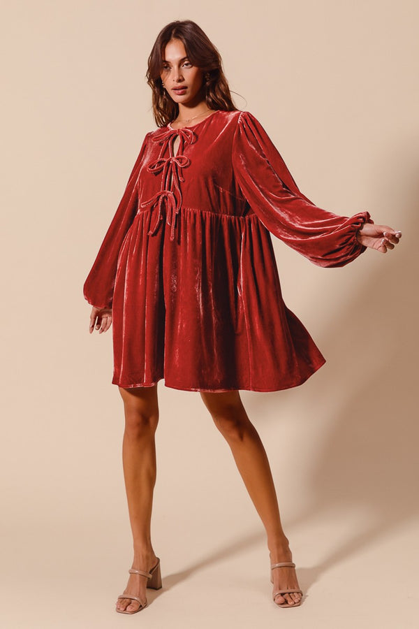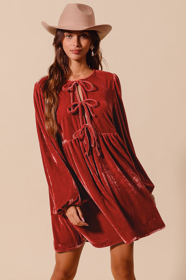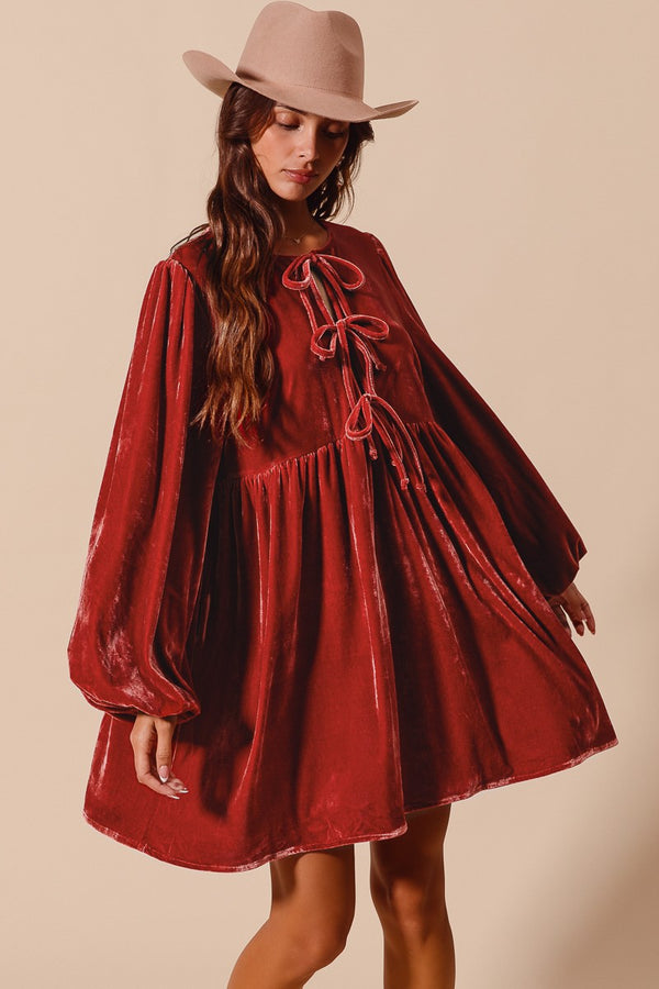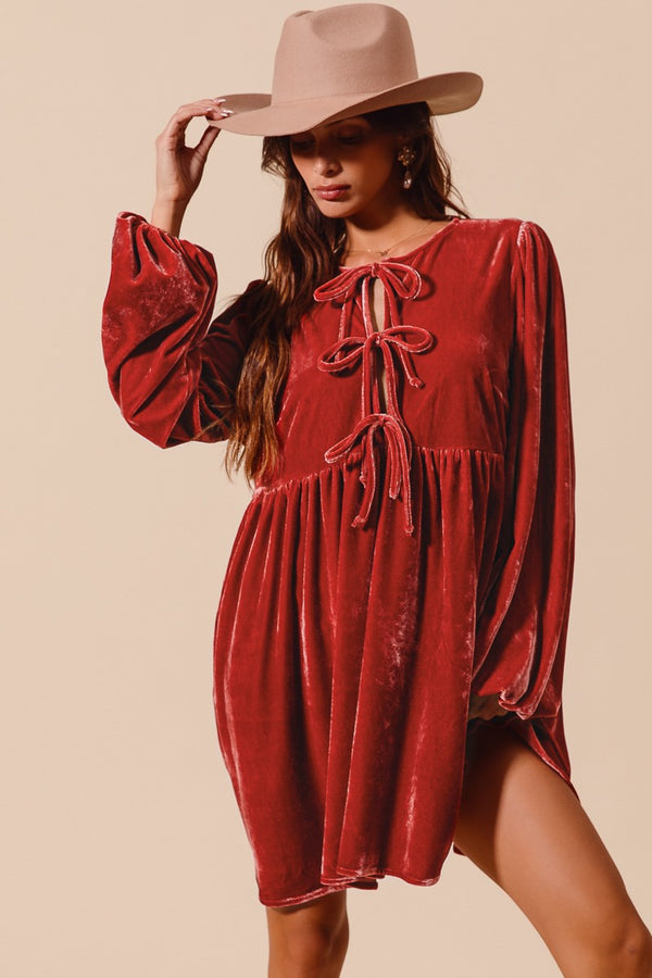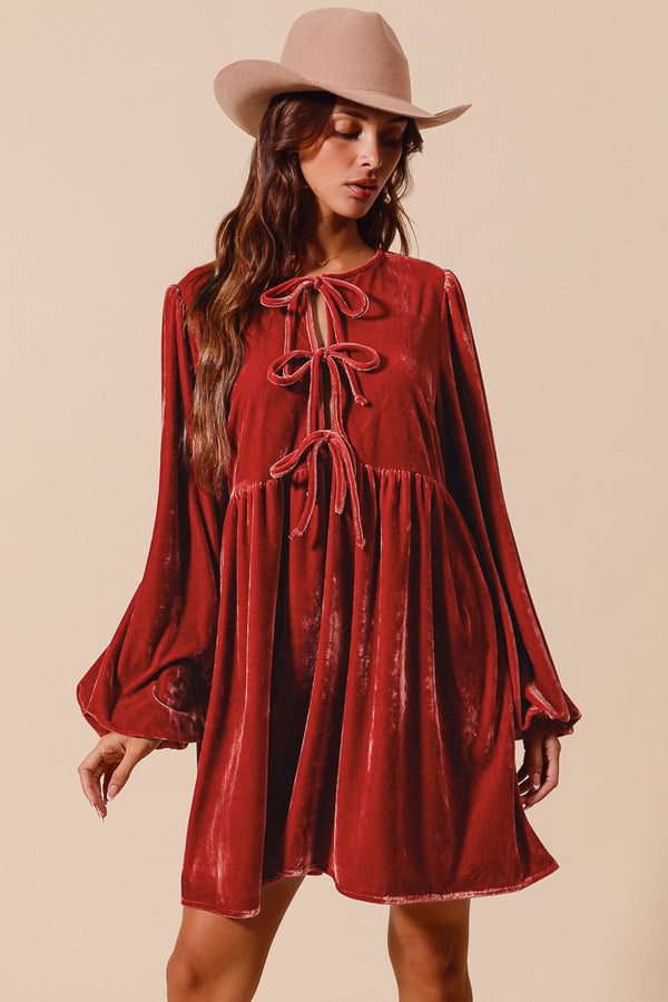 Spread some holiday cheer with our Holiday Spirit Bow Dress. This mini dress features luxurious velvet, playful bubble sleeves, and adorable bow ties. Perfect for any holiday party or festive occasion. Available in Carmine or Jade. 'Tis the season to be stylish!