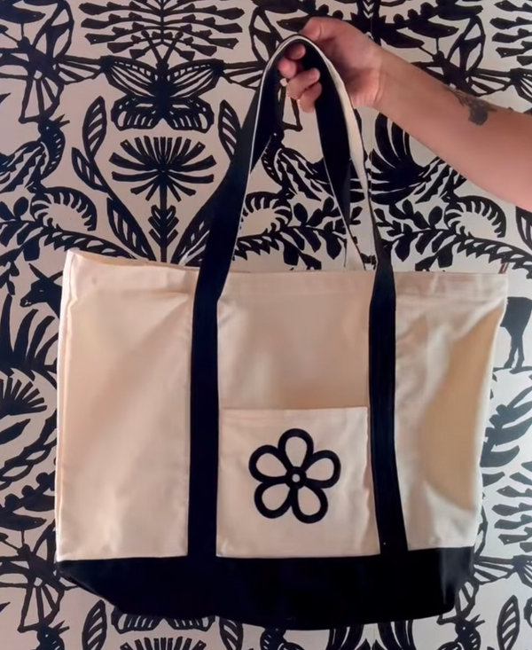 Carry your essentials in style with our DLB Reusable Tote Bag, featuring a convenient zip top to keep everything secure. Thoughtfully designed with both interior and exterior pockets for smart organization, plus our signature daisy logo displayed on the front. Here's the fun part—bring it back when you shop and score 5% off your next purchase! It's the tote that keeps on giving.