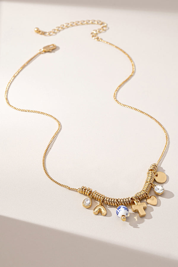 Dazzle your way through life with our Always Faithful Charm Necklace! This playful gold-tone beauty features hollow donut beads and a treasure trove of meaningful charms—crystal drops, hearts, cross, and more—all dancing along a sleek snake chain. Wear it solo against your favorite V-neck for instant outfit magic, or mix it up by layering with other necklaces for a look that says "I woke up this fabulous!" Each charm brings its own special mojo of faith, love, and protection to your everyday style adventures.
