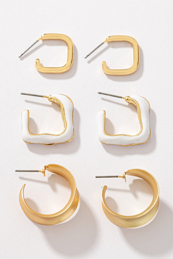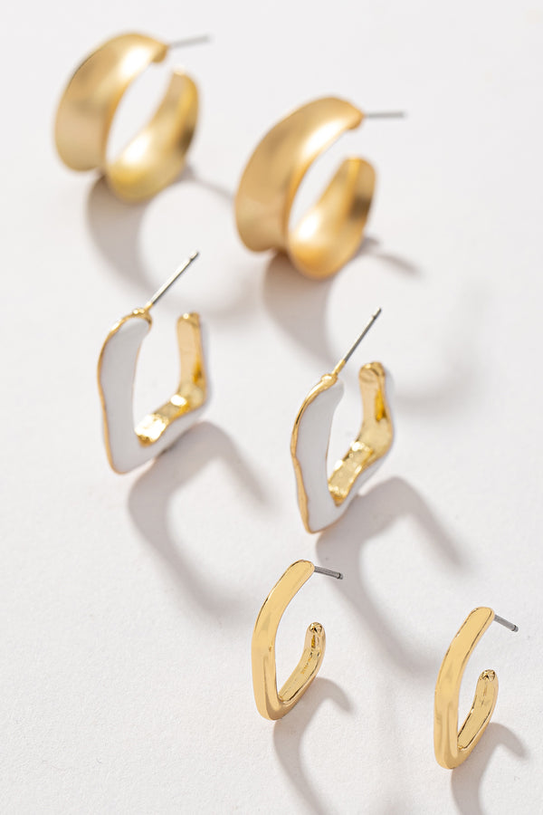 Indulge in the timeless elegance of our Classic Elegance Hoop Earring Trio. This trio set includes an enamel pair and two pairs in gold-tone metal, creating a versatile and playful addition to your wardrobe. Each lightweight hoop showcases a simple and classic design, perfect for stacking or wearing solo. Elevate any look with these must-have hoops.