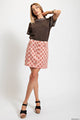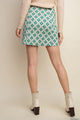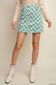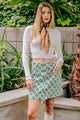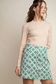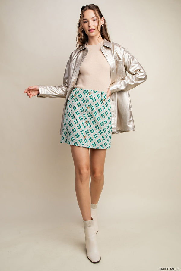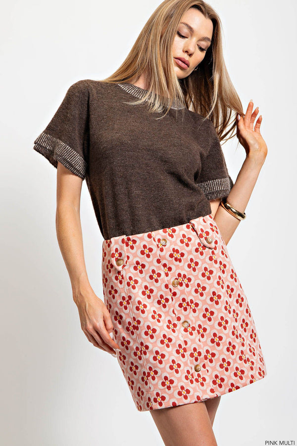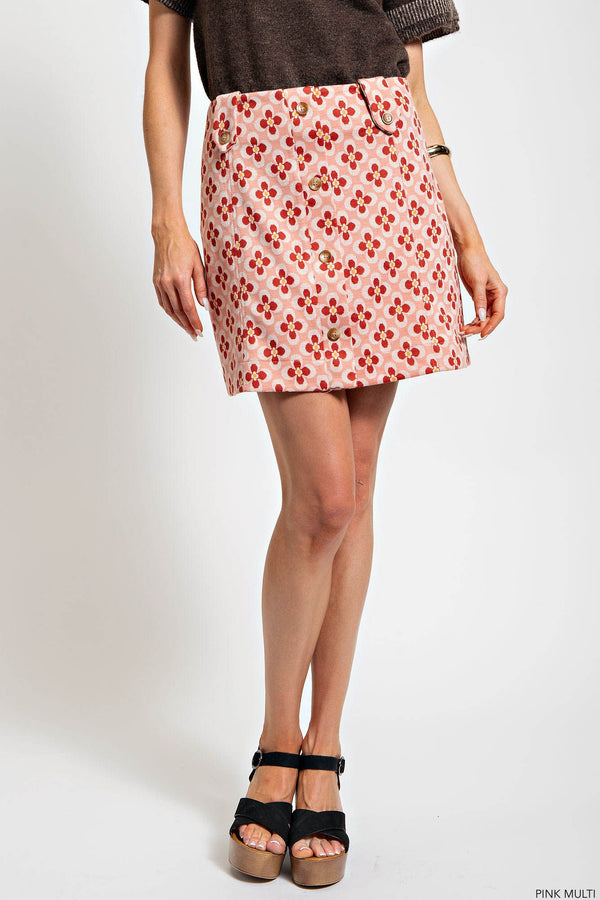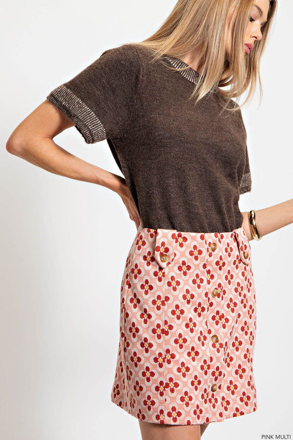 Introducing our Geo Floral Mini Skirt, perfect for any retro fashion lover. Made from soft knit jacquard and featuring a funky geometric floral print, this mini skirt is both comfortable and stylish. The faux button front adds a touch of 70's mod vibe while eliminating any gapping. Transition effortlessly from sandals to boots for a versatile addition to your wardrobe. Available in green or pink.